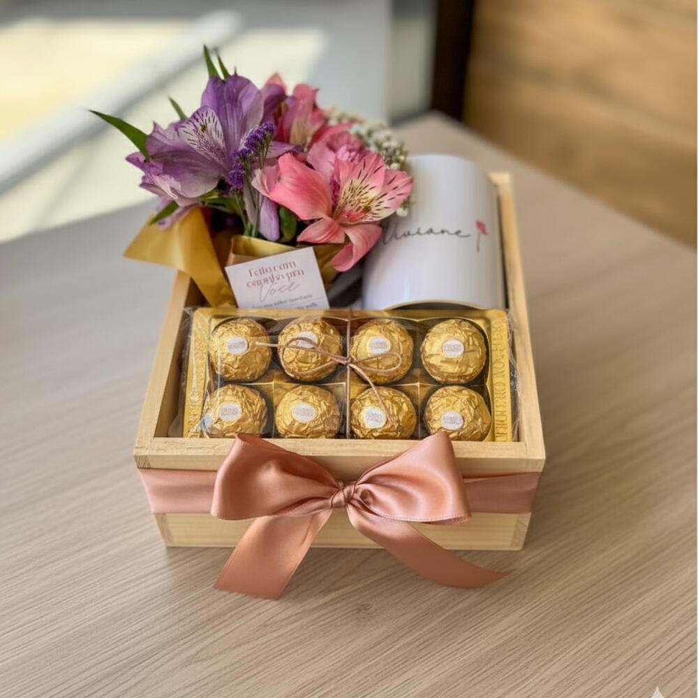 Este kit de presente primorosamente montado é o presente perfeito para quem você ama. Contendo 8 unidades deliciosas do amado Ferrero Rocher, para agradar aos paladares mais sofisticados. Também incluído estão 5 hastes de Astrómelia, adicionando um toque de elegância natural à caixa. Esta série elegante é aprimorada por um coração encantador feito à mão, envolto por um estiloso laço de cetim. Tudo é lindamente apresentado em uma caixa de pinus, adicionando um elemento de luxo rústico ao presente. Este kit é uma maneira maravilhosa de demonstrar amor e apreço, tornando qualquer celebração memorável.