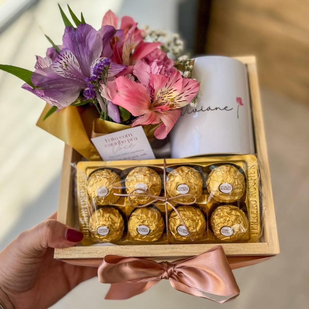 ferrero roche de 8 unidades - 1 pcs laço em cetim - 1 pcs caixa em pinus - 1 pcs astromélia (haste) - 5 pcs cabeca com coração - 1 pcs