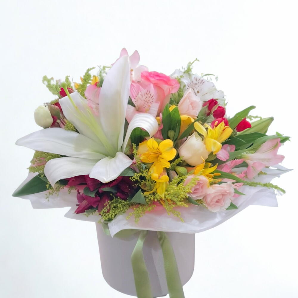 Este produto se destaca por ser uma bela combinação de flores mistas acompanhadas de folhagens, meticulosamente organizadas em uma elegante caixa. O arranjo é ainda mais valorizado com um delicado laço de cetim, que acrescenta um toque sofisticado ao conjunto. A embalagem de alta qualidade garante a preservação e a apresentação impecável do arranjo, tornando-o o presente ideal para celebrar qualquer ocasião especial.