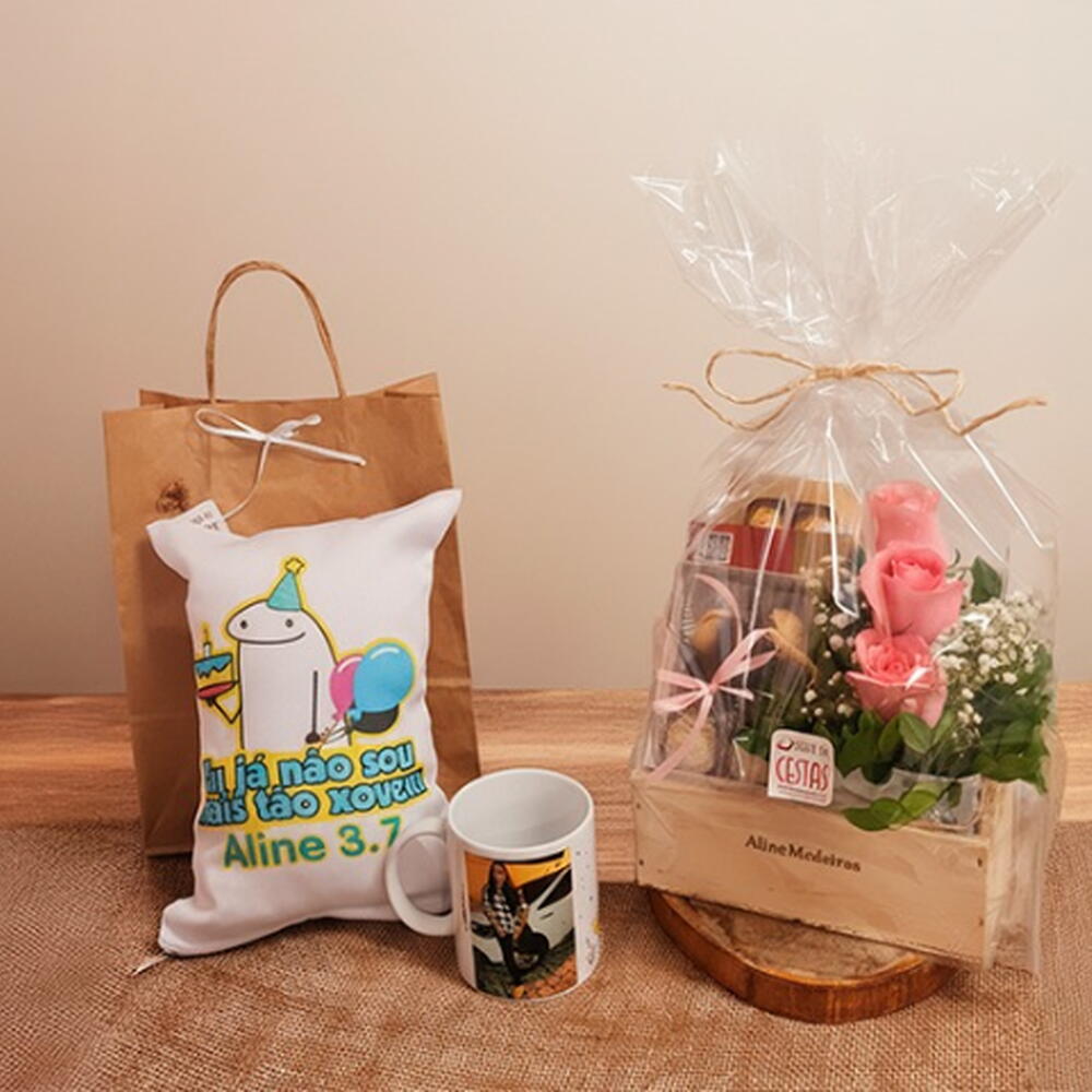 1 chocolate doce mensagem (45g): você é especial - 1 pcs 1 caixa de chocolates ferrero rocher com 8 chocolates - 1 pcs 1 caixa com 6 docinhos artesanais - 1 pcs 1 arranjo com 3 rosa naturais (azuis ou rosa) - 1 pcs caixote de madeira personalizado com nome gravado a laser (10x20x10 cm) - 1 pcs almofada em tecido branco de poliéster (30x20cm) personalizada - 1 pcs caneca porcelana personalizada (350 ml) - 1 pcs