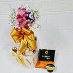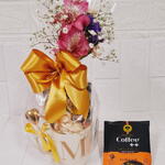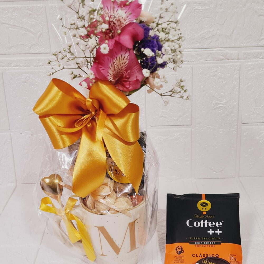 Este encantador kit de presente é perfeito para qualquer ocasião especial. Inclui um elegante laço, ideal para adicionar um toque de estilo a qualquer pacote. Para os amantes do café, o kit vem com um pacote de drip cafe, pronto para ser saboreado numa linda caneca personalizada com a inicial do seu nome. Acompanha uma cápsula Havana para 150ml de água quente, ideal para preparar uma deliciosa xícara de café. Além disso, o presente traz um pacotinho de biscoitos fracionados, perfeitos para um lanche rápido. Para tornar a experiência ainda mais encantadora, incluímos uma colher de formato coração dourada, adicionando um toque romântico a este kit de presente. Ideal para mimar alguém especial ou simplesmente para se presentear!