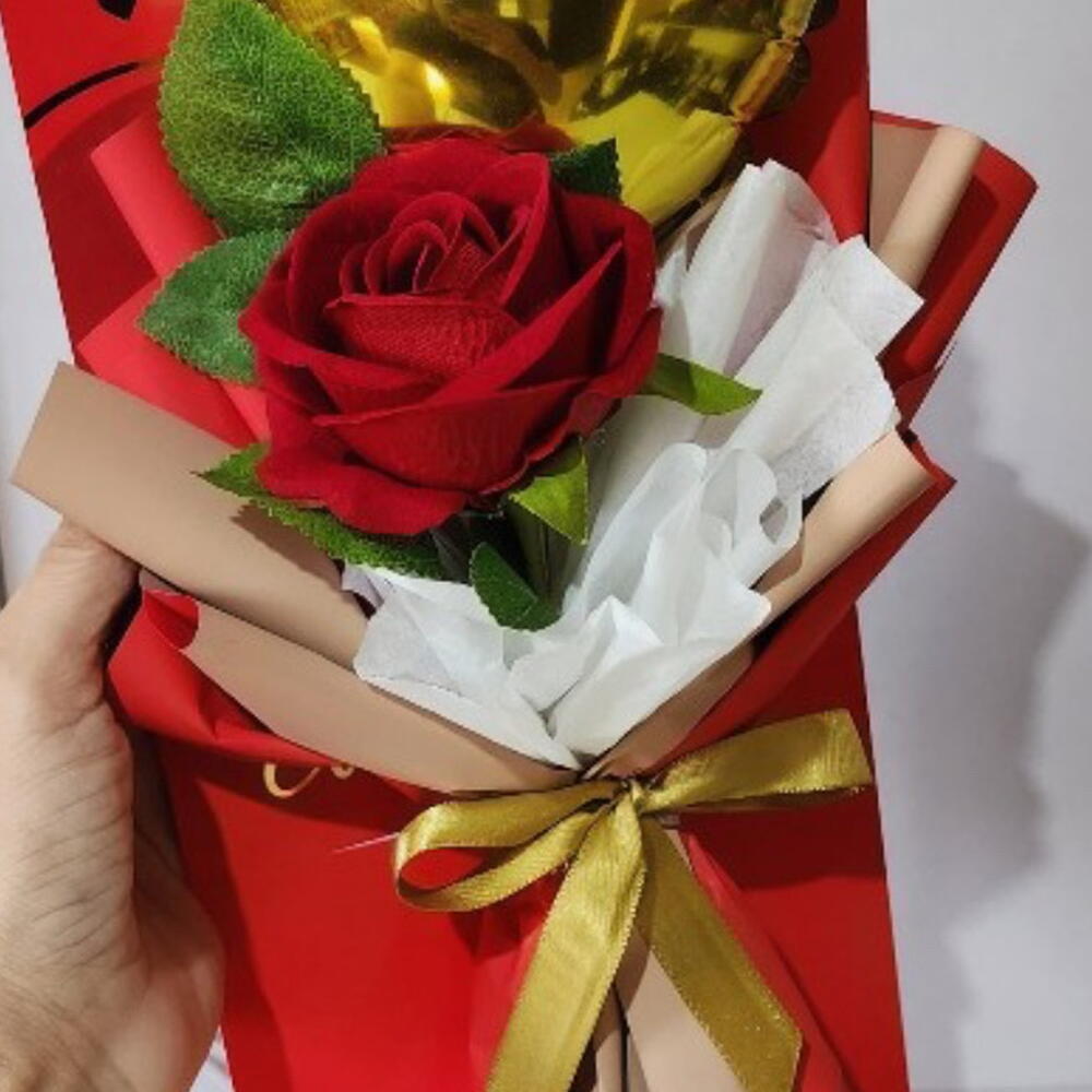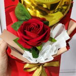 Um presente delicado e cheio de significado: uma rosa artificial que simboliza amor duradouro, acompanhada de um card com dedicatória personalizada, um laço artesanal elegante e um balão em formato de coração de 45cm para dar o toque final de charme e romantismo.