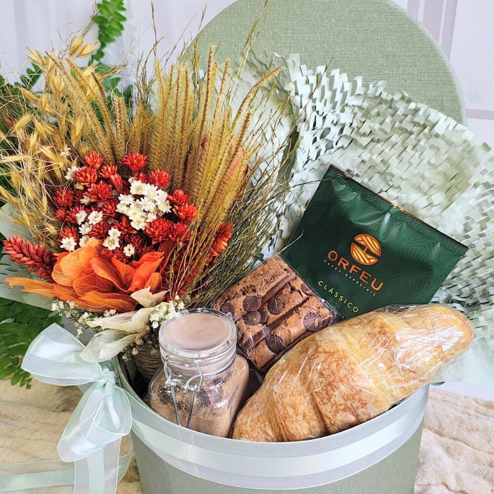 brownie de chocolate - 1 pcs fita em cetim - 1 pcs cappuccino artesanal - 1 pcs croissant folhado de manteiga - 1 pcs buque de flores desidratadas premium - 1 pcs box cartonado premium - 1 pcs drip coffee especial orfeu café para coar - 1 pcs