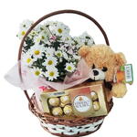 Celebre momentos especiais com a Cesta de Aniversário composta por uma adorável pelúcia, um mini vaso de margaridinhas e um irresistível Ferrero Rocher T8. O presente perfeito para alegrar o dia e adoçar a vida da pessoa amada. Um gesto de carinho que será, sem dúvida, inesquecível!