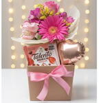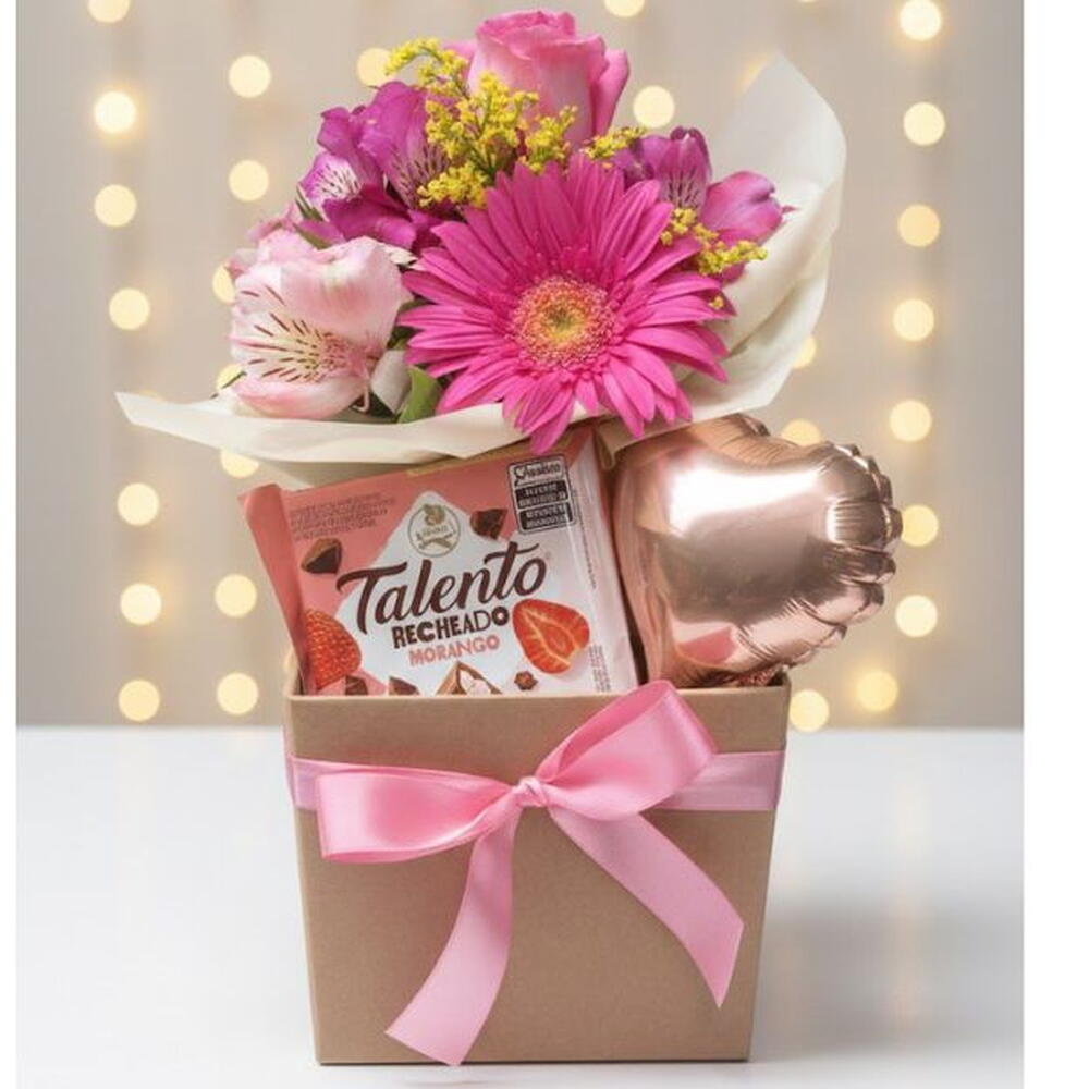 mini balão em formato de coração - 1 pcs chcocolate talento - 1 pcs arranjo floral com uma rosa - 1 pcs gerebera e astromelias - 1 pcs uma caixa em papel rigido com laço de fita - 1 pcs