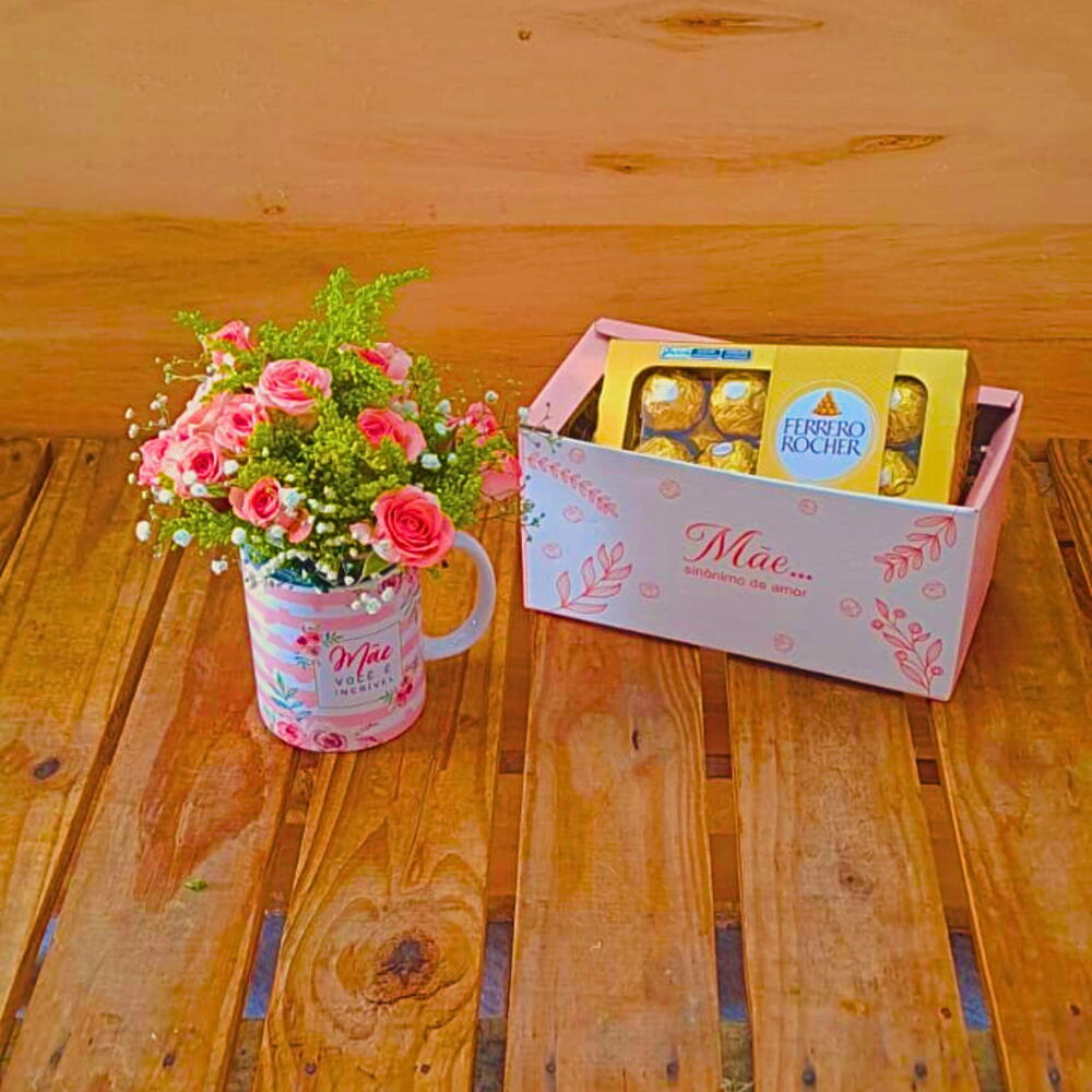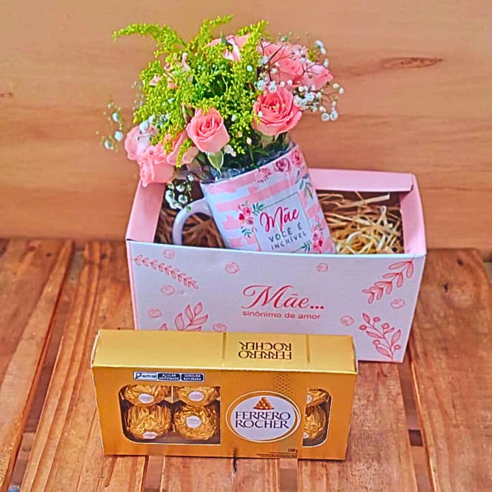 Cesta Dia das Mães com Flores e Ferrero Rocher – Um Presente Repleto de Amor e Sofisticação! Surpreenda a mulher mais especial da sua vida com esta Cesta Dia das Mães que une delicadeza, sabor e carinho em um único presente inesquecível. Pensada para celebrar o amor e a gratidão, esta cesta é o presente perfeito para tornar o Dia das Mães ainda mais emocionante e doce. O que você encontra nesta linda cesta? 1 caneca de porcelana litografada com a frase Mãe você é incrível, ideal para acompanhar os momentos de pausa e aconchego. Mini rosas naturais cuidadosamente arranjadas dentro da caneca, formando um lindo e delicado arranjo floral que transmite todo o afeto que você sente. 1 caixa com 8 bombons Ferrero Rocher, símbolo de luxo e sabor irresistível que vai adoçar o dia da sua mãe. 1 caixa box litografada com a mensagem Mãe Sinônimo de Amor, que garante uma apresentação sofisticada e especial para este presente único. Dimensões da cesta: Altura: 20 cm Comprimento: 22 cm Largura: 11 cm Por que escolher a Cesta Dia das Mães com Flores e Ferrero Rocher? Presente completo e elegante, que combina a beleza das flores naturais com o sabor refinado dos bombons Ferrero Rocher. Mensagem de amor personalizada que valoriza ainda mais o gesto de carinho. Apresentação sofisticada e prática, perfeita para surpreender e emocionar. Transforme o Dia das Mães em um momento inesquecível! Demonstre todo o seu amor com esta cesta que une delicadeza, sabor e significado. Garanta já a sua Cesta Dia das Mães com Flores e Ferrero Rocher e faça quem você ama se sentir verdadeiramente especial!