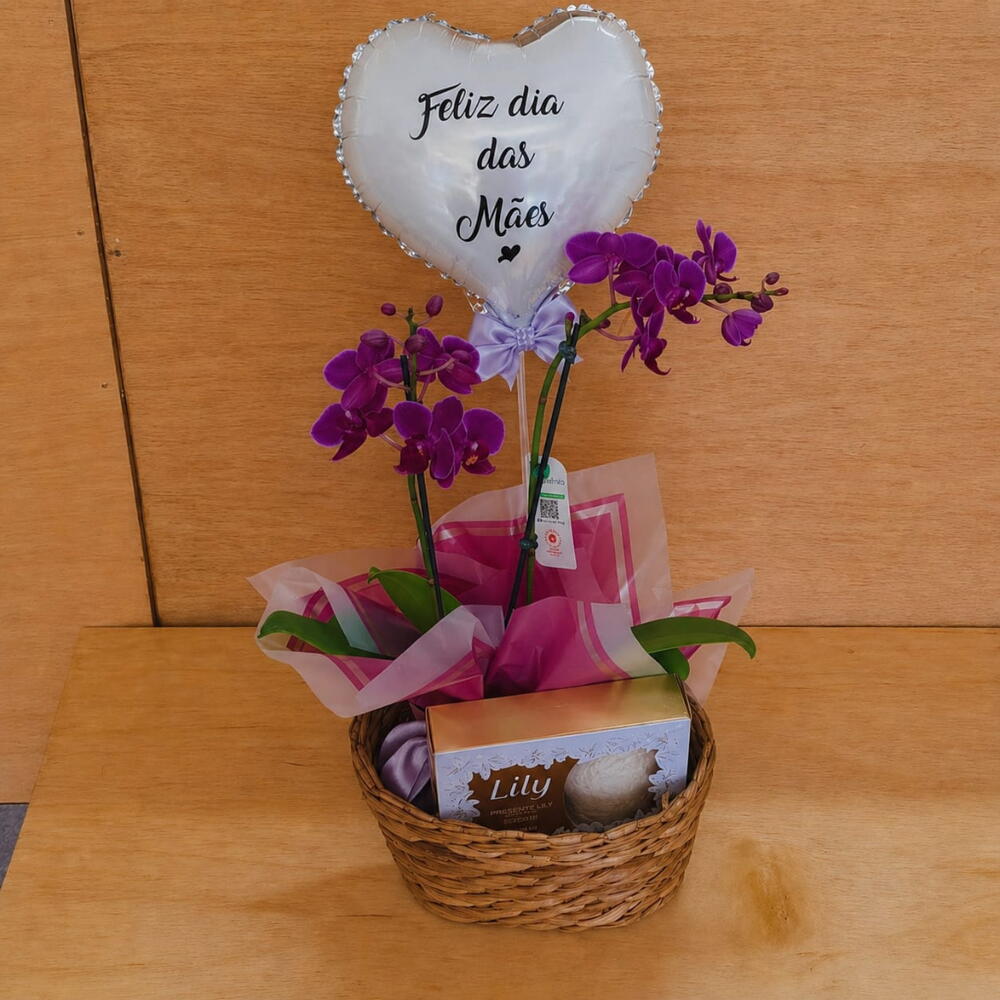 Cesta Dia das Mães com Mini Orquídea Phalaenopsis – Um Presente Elegante e Delicado! Surpreenda a mulher mais especial da sua vida com esta linda cesta cuidadosamente montada para o Dia das Mães. Com um toque sofisticado e repleto de carinho, ela reúne beleza natural, aromas suaves e um toque festivo para celebrar este momento único. Conteúdo da Cesta: 1 mini orquídea Phalaenopsis com 2 hastes: uma planta elegante e fácil de cuidar, símbolo de amor, beleza e delicadeza. 1 caixa com 2 sabonetes em barra perfumados Boticário Lily (90g cada): fragrância suave e envolvente, perfeita para momentos de relaxamento. 1 balão prateado “Feliz Dia das Mães”: adiciona um toque festivo e alegre à composição. 1 cesta de taboa decorada com papel poli e laço de cetim: acabamento artesanal que valoriza o presente. Medidas: Altura total: 55 cm Diâmetro da cesta: 30 cm Por que escolher esta cesta? Esta combinação harmoniosa entre a beleza natural da orquídea e a delicadeza do sabonete perfumado cria um presente completo e encantador. Ideal para demonstrar afeto, cuidado e gratidão de forma sofisticada e inesquecível. Benefícios: - Presente que une decoração e bem-estar - Produto natural e duradouro - Embalagem charmosa pronta para presentear Garanta já sua Cesta Dia das Mães com Mini Orquídea Phalaenopsis e faça deste Dia das Mães uma celebração repleta de amor, beleza e elegância!