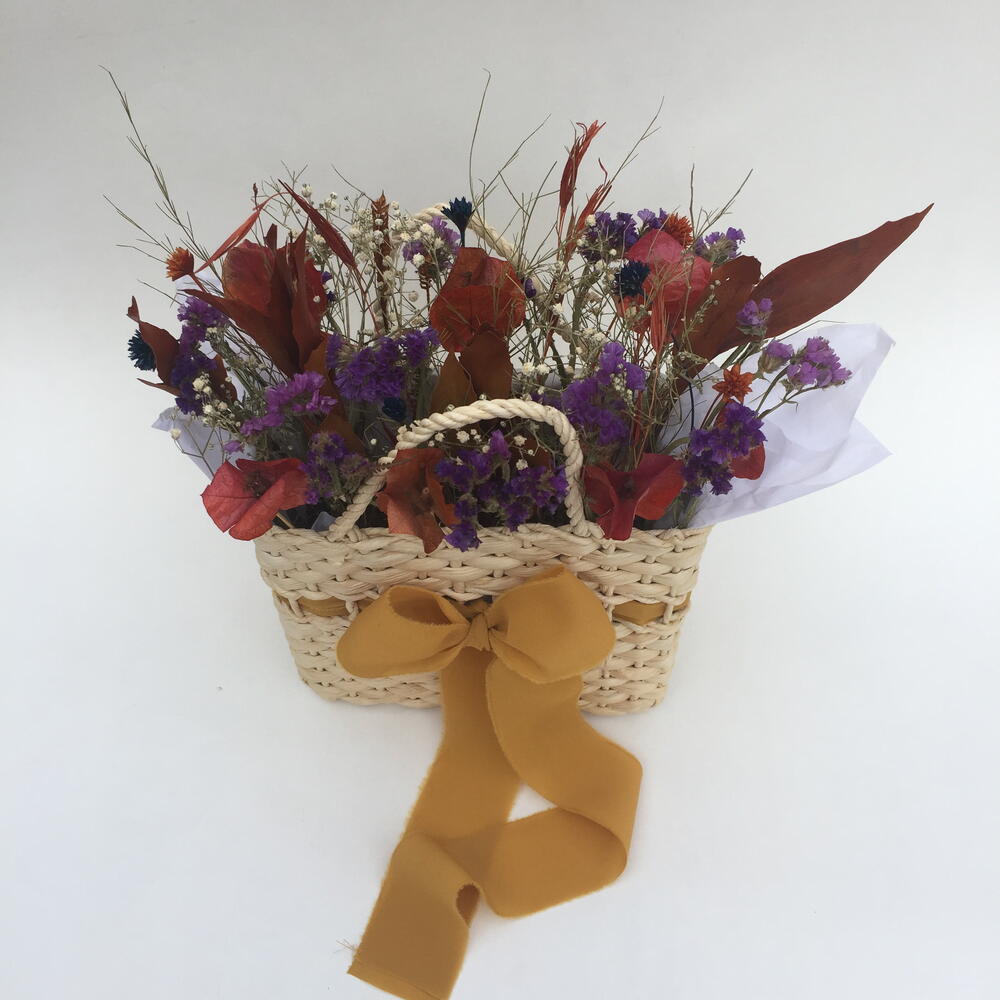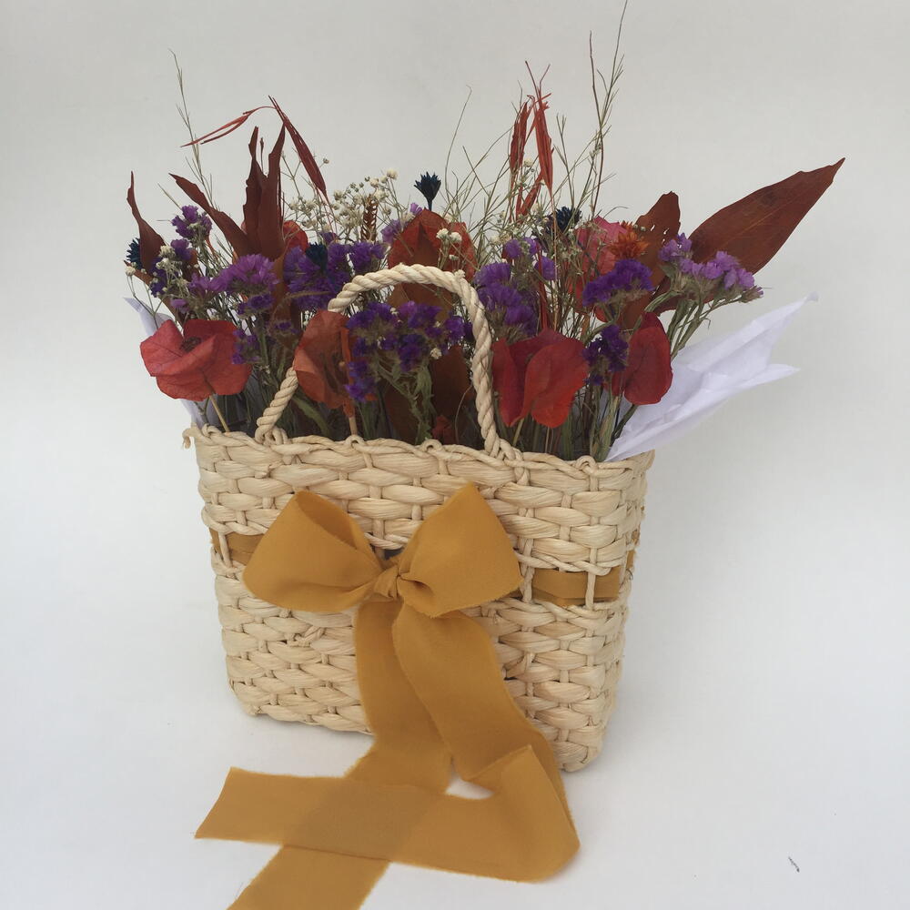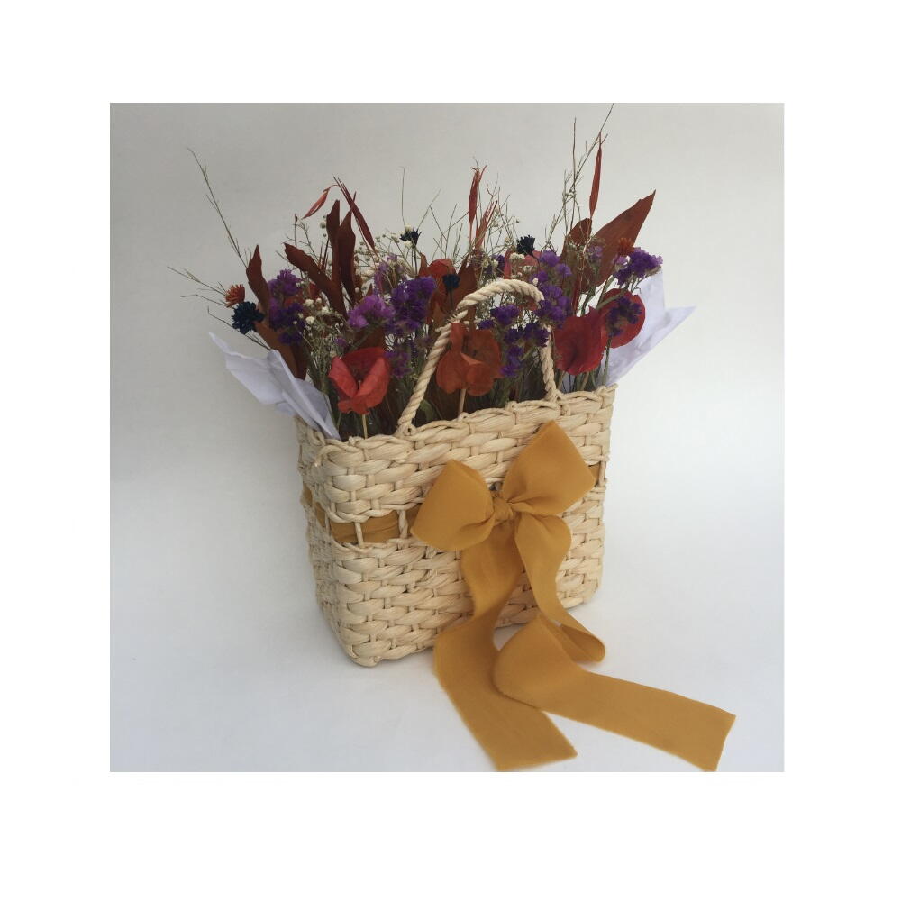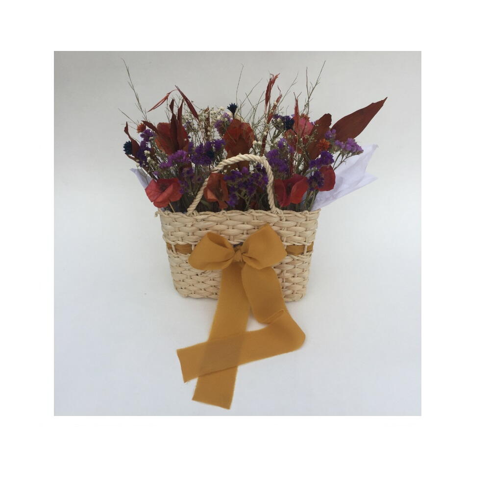 embalagem para envio (sacola ou caixa). - 1 pcs cesta de palha p com fita e tag. - 1 pcs mix de flores naturais desidratadas compondo a cesta. - 1 pcs
