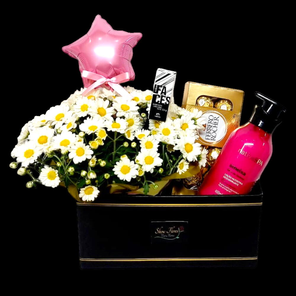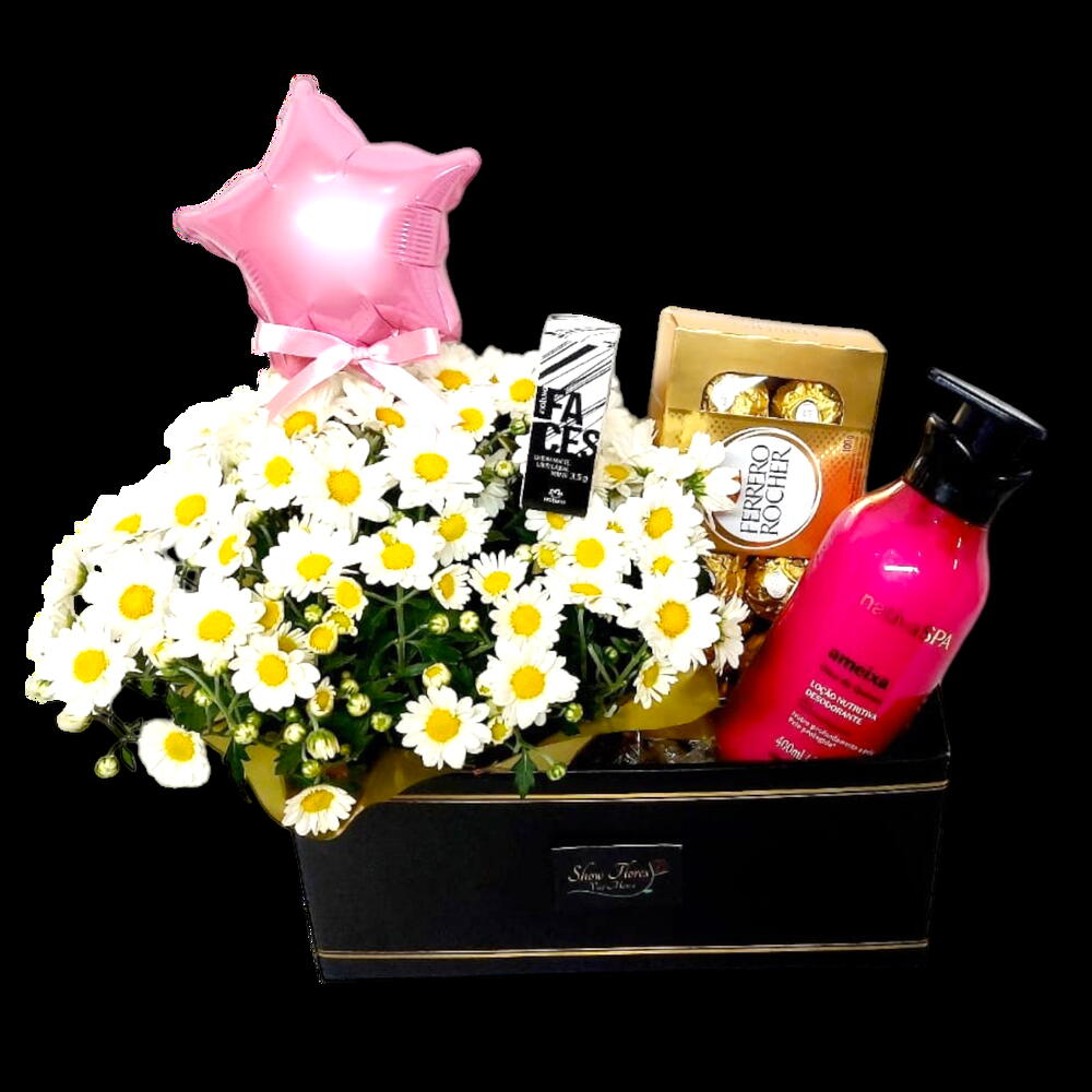 laço de cetim - 1 pcs mini balão - 1 pcs embalagem celofane - 1 pcs batom - 1 pcs caixa de presente - 1 pcs linda margarida - 1 pcs hidratante nativa spa - 1 pcs ferrero rocher 50gr (4 bombons) - 1 pcs