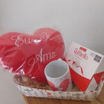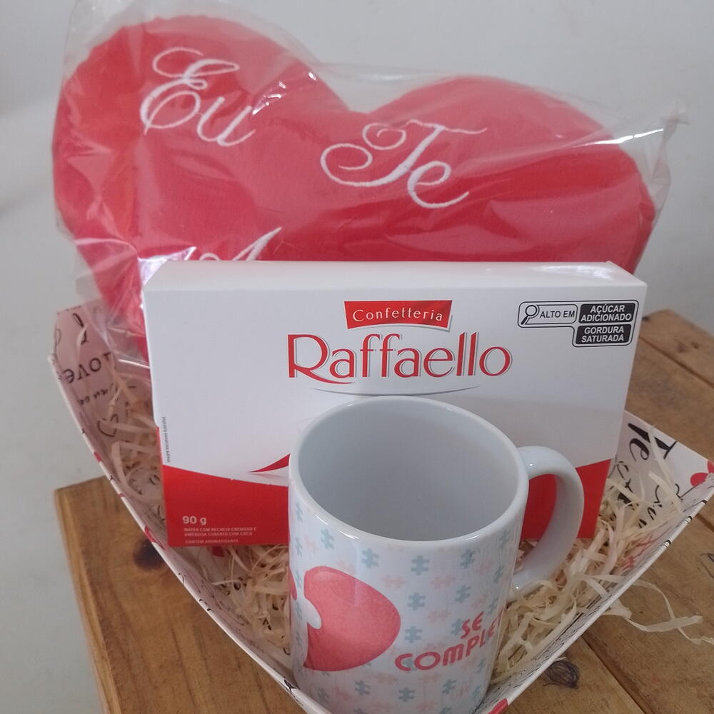 cesta - 1 pcs raffaello caixa com 9 unidades 90g - 1 pcs caneca porcelana (de acordo com a disponibilidade) - 1 pcs coração escrito eu te amo - 1 pcs
