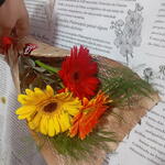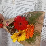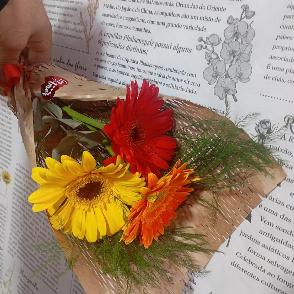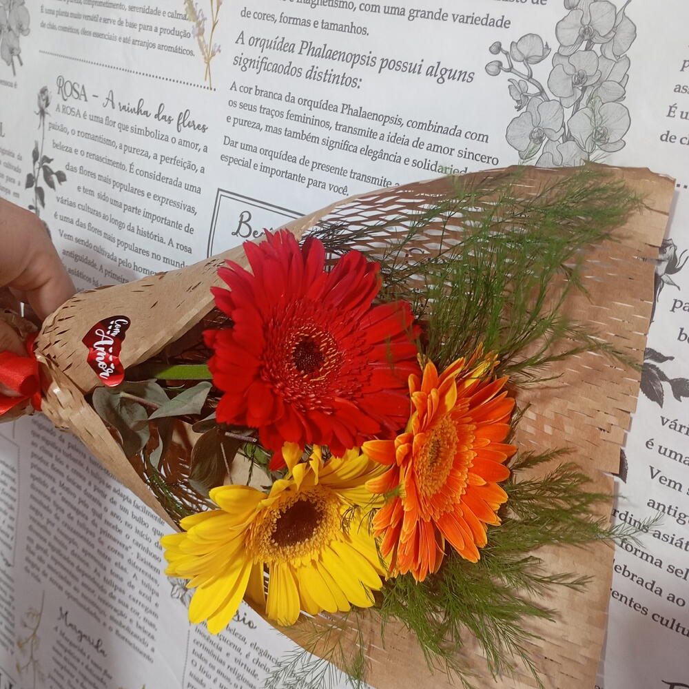 Mimo de gérberas coloridas, revestido com papel pardo ou papel colmeia, com laço colorido