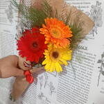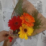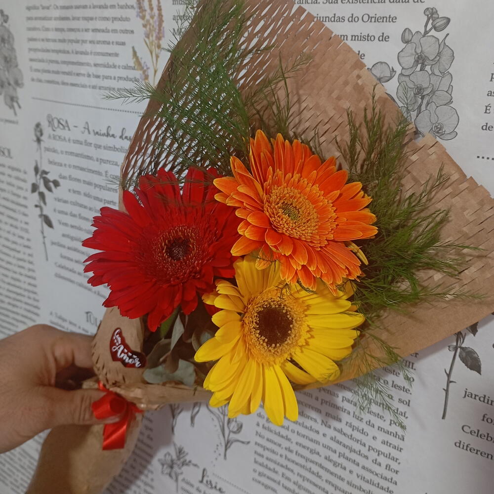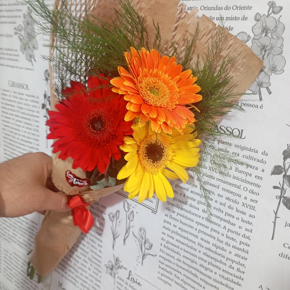 laço - 1 pcs embalagem tipo tela - 1 pcs mimo de gérbera coloridas - 3 pcs
