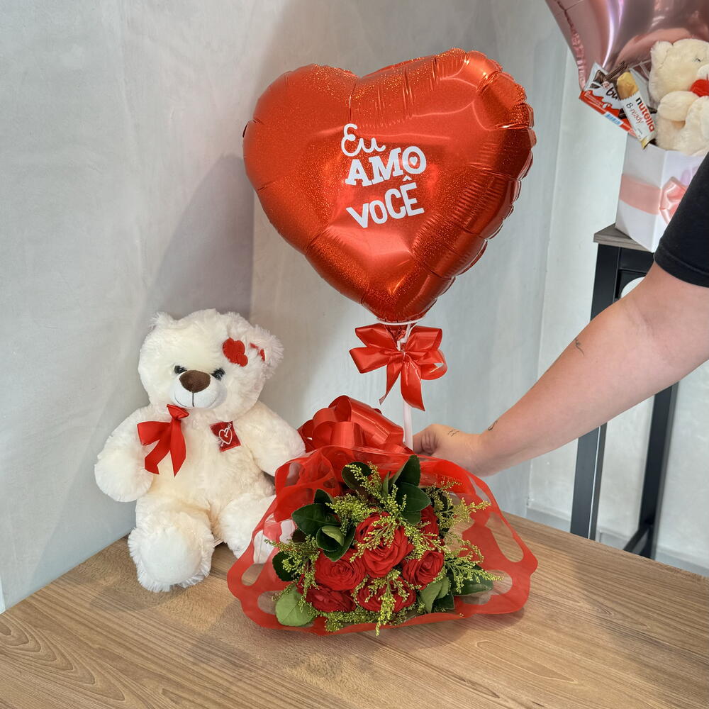 Uma surpresa romântica e apaixonante, ideal para demonstrar amor de forma inesquecível! Este presente especial acompanha: • 🎈 1 Balão de coração com a frase Eu Amo Você – com opção de personalização para tornar o momento ainda mais único • 🌹 1 Buquê com 6 Rosas Vermelhas – clássico e elegante, perfeito para expressar paixão • 🧸 1 Pelúcia média – fofa e cheia de carinho, para abraçar e guardar com amor ✨ Perfeito para o Dia dos Namorados, aniversários, surpresas românticas ou para dizer eu te amo de um jeito especial.