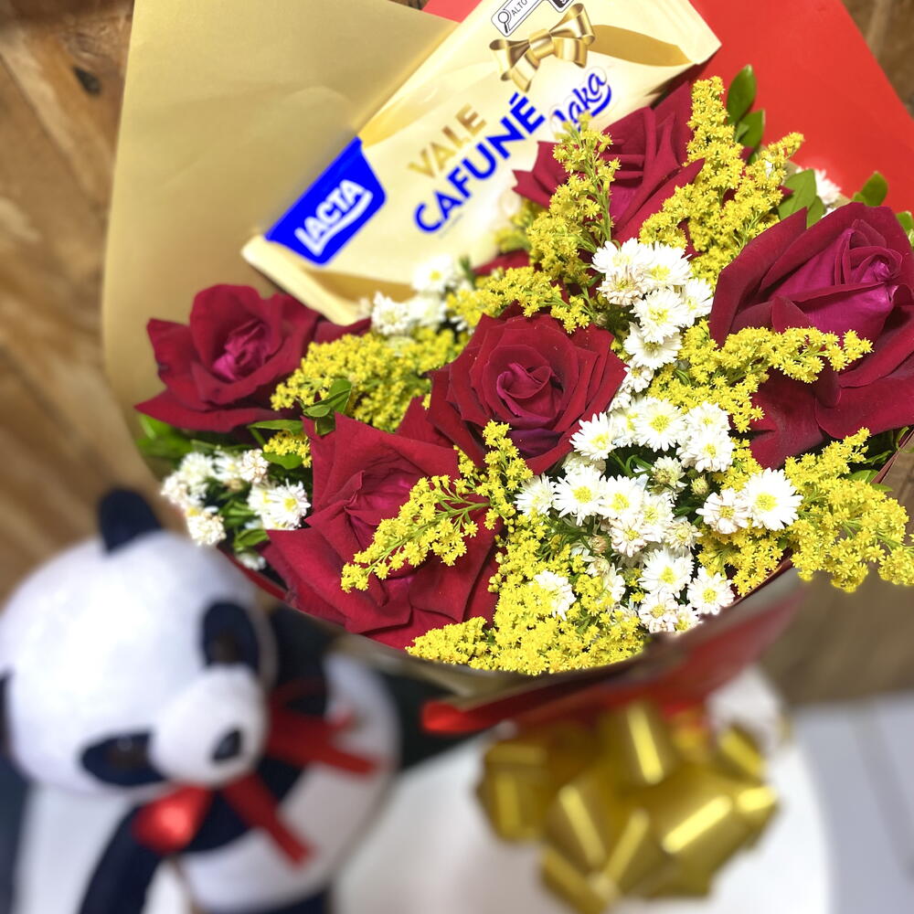 Este adorável presente é composto por uma deliciosa barra de chocolate de alta qualidade, um encantador buquê com cinco rosas vermelhas e um ursinho de pelúcia panda super fofo. Perfeito para expressar seu amor e afeto em qualquer ocasião.