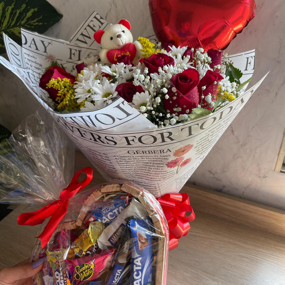 Este kit especial de presente é composto por uma delicada combinação de itens perfeitos para surpreender uma pessoa querida. Contém três unidades de deliciosos chocolates Tango, embelezados por doze rosas vermelhas vibrantes. Acompanham também um elegante laço vermelho, um mimoso chaveiro de ursinho e um encantador balão em formato de coração. A folhagem selecionada acrescenta um toque extra de sofisticação, enquanto o acabamento com celofane transparente, finalizado com um laço poli acetinado, transborda elegância. Adicionalmente, conta com duas unidades de journal branco e um arranjo suave de gypsofila e margaridinhas. Para finalizar, um coração de madeira contendo chocolates irresistíveis proporciona a surpresa ideal. Um presente com certeza marcante e cheio de emoção.