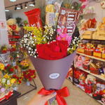 rosa vermelha - 1 pcs embalagem - 1 pcs folhagens - 1 pcs laço - 1 pcs suflair 50g - 1 pcs mm 45g - 1 pcs rosa carola - 1 pcs ferrero rocher 3uni - 1 pcs