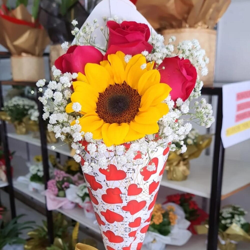 Este adorável buquê é um poema de cores e aromas. Composto por 1 luminoso girassol, simbolizando a luz e a felicidade; 3 rosas botão, símbolos de amor e gratidão; um pouco de folhagem para realçar a beleza das flores e envolvido em uma embalagem elegante. Para torná-lo ainda mais especial, ele vem com um lindo laço. É a escolha perfeita para expressar seus sentimentos em qualquer ocasião.