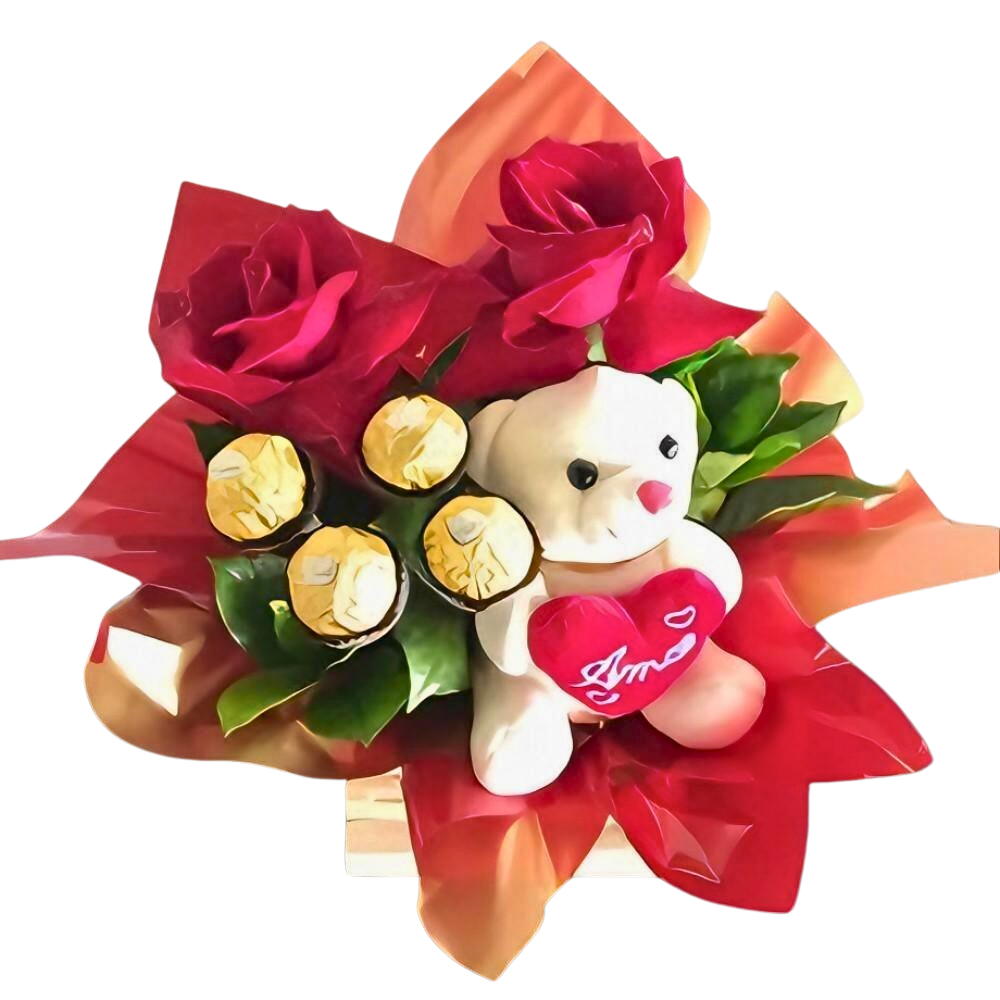 Este presente encantador é a combinação perfeita de doçura e amor. Contém um cachepot de alto padrão, quatro deliciosos chocolates Ferrero Rocher e duas belas rosas vermelhas. Para tornar o presente ainda mais especial, adicionamos um encantador ursinho amor para demonstrar seus sentimentos. São perfeitos para qualquer ocasião especial!