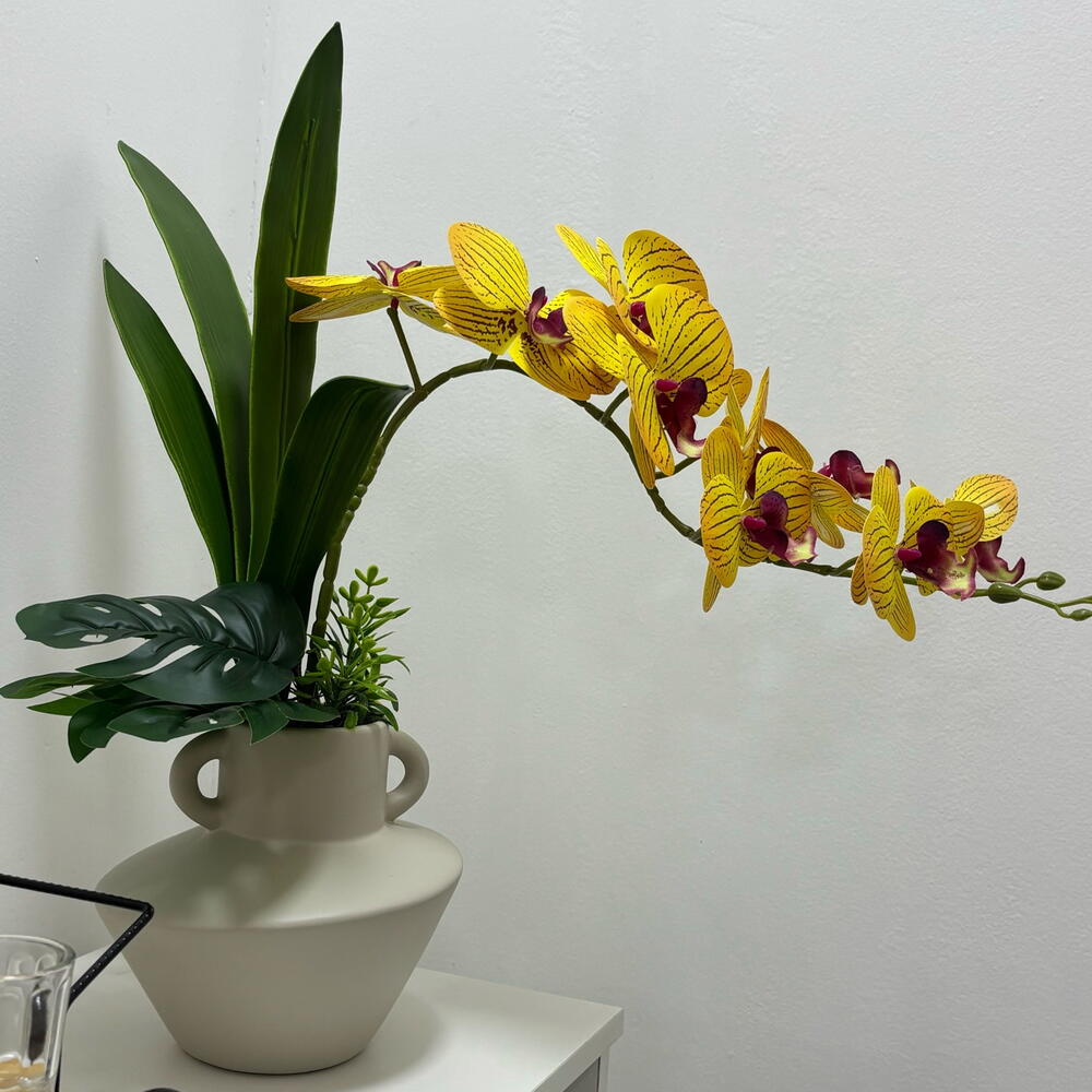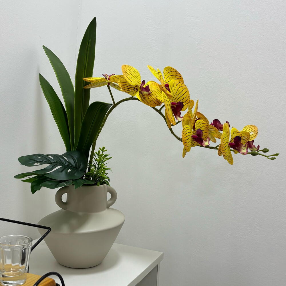 Deixe a natureza tocar suavemente sua decoração comeste arranjo de flores composto por uma elegante orquídea e folhagem fresca, harmoniosamente aninhadas em um vaso clássico. Perfeito para iluminar qualquer ambiente, este arranjo será um verdadeiro ponto de destaque, trazendo um toque de sofisticação e frescor onde quer que seja colocado.