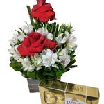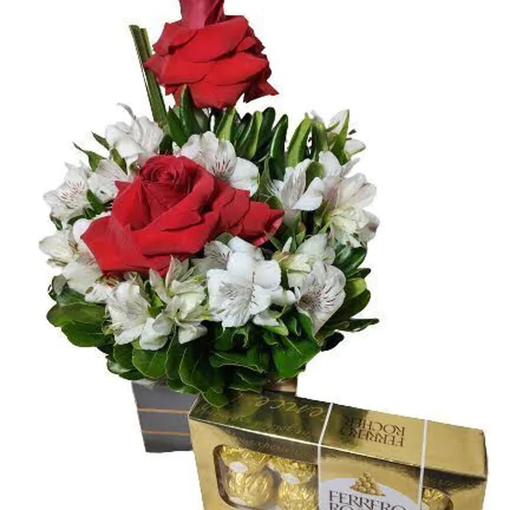Composição: Cachepô de madeira super charmoso, com 02 rosas importadas, astromélias fresquinhas e 01 delicioso chocolate Ferrero Rocher (t-8 unidades) ou Ferrero Rocher Collection (t-7). Durabilidade: As flores de corte duram em média de 3 a 5 dias, trazendo um toque especial para qualquer ocasião. Obs: Todos os itens poderão sofrer alterações dependendo da disponibilidade local, mas sempre mantendo a qualidade que você merece. Imagens meramente ilustrativas - a apresentação pode variar de acordo com a data da compra e disponibilidade do fornecedor. Surpreenda alguém especial com esse combo incrível! É o presente perfeito para deixar qualquer momento mais doce e florido!