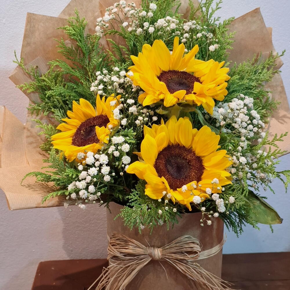 Brilhe o seu dia com esta deslumbrante mistura de flores em caixa! Com 1 unidade de girassol vibrante que vai roubar a cena, acompanhado de 3 unidades de folhagens frescas e 1 unidade de mosquitinhos que adicionam um toque de delicadeza a este arranjo. É o presente perfeito para demonstrar apreço, amor e alegria em qualquer ocasião.