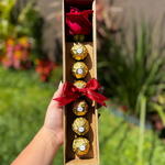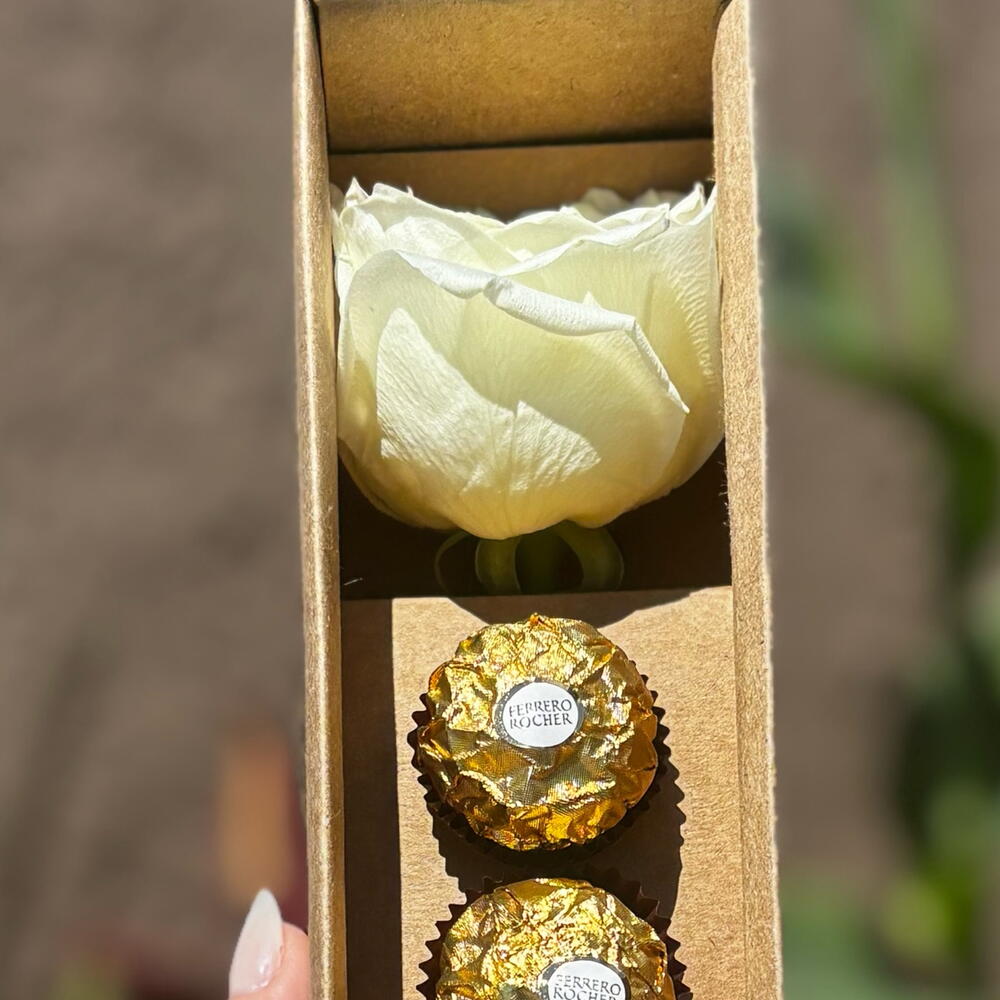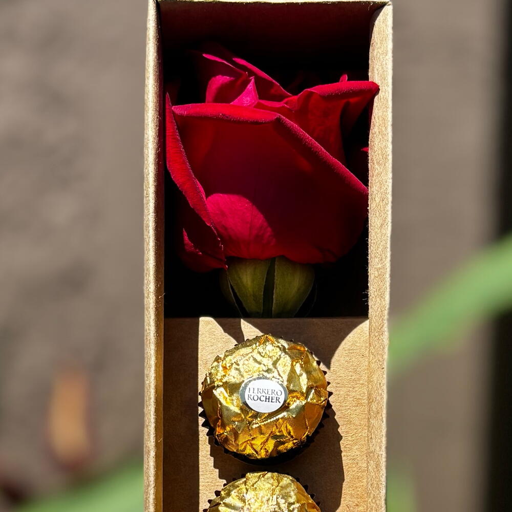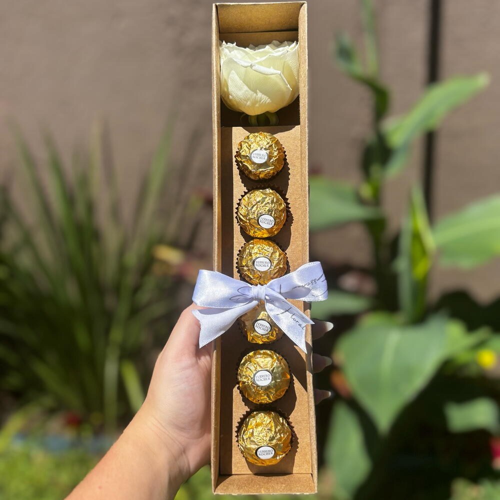 Este elegante arranjo de flores vem em uma sofisticada caixa cartonada, contendo uma belíssima rosa como peça central. Acompanhada por um delicado laço, a composição fica ainda mais encantadora. Para completar, o conjunto inclui seis deliciosos chocolates Ferrero Rocher, proporcionando uma doce surpresa.