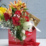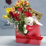 Este Kit de Presente é perfeito para expressar carinho e surpreender alguém especial. Composto por um chaveiro de pelúcia, que aconchega com sua maciez em cores variadas, a graça também está presente em cinco unidades de flores variadas - é possível verificar a disponibilidade das espécies via chat. Para completar, uma caixa com oito unidades do irresistível Ferrero Rocher, garantindo um toque de doçura à surpresa. Garanta este presente encantador e repleto de sentimentos bons!