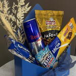 amendoim japonês - 1 pcs bis xtra 45g - 1 pcs oreo 36g - 1 pcs red bull 250ml - 1 pcs envelope decorado para você - 1 pcs lacta shot - 1 pcs