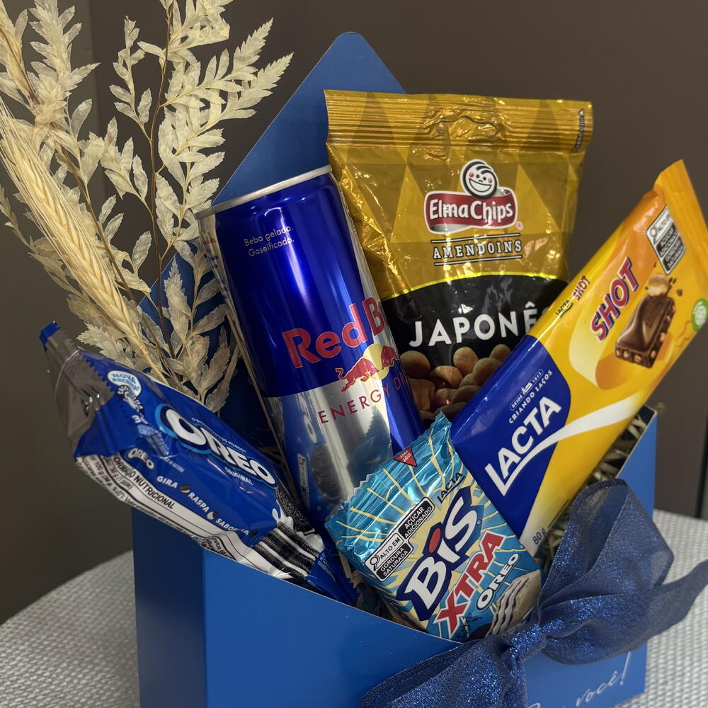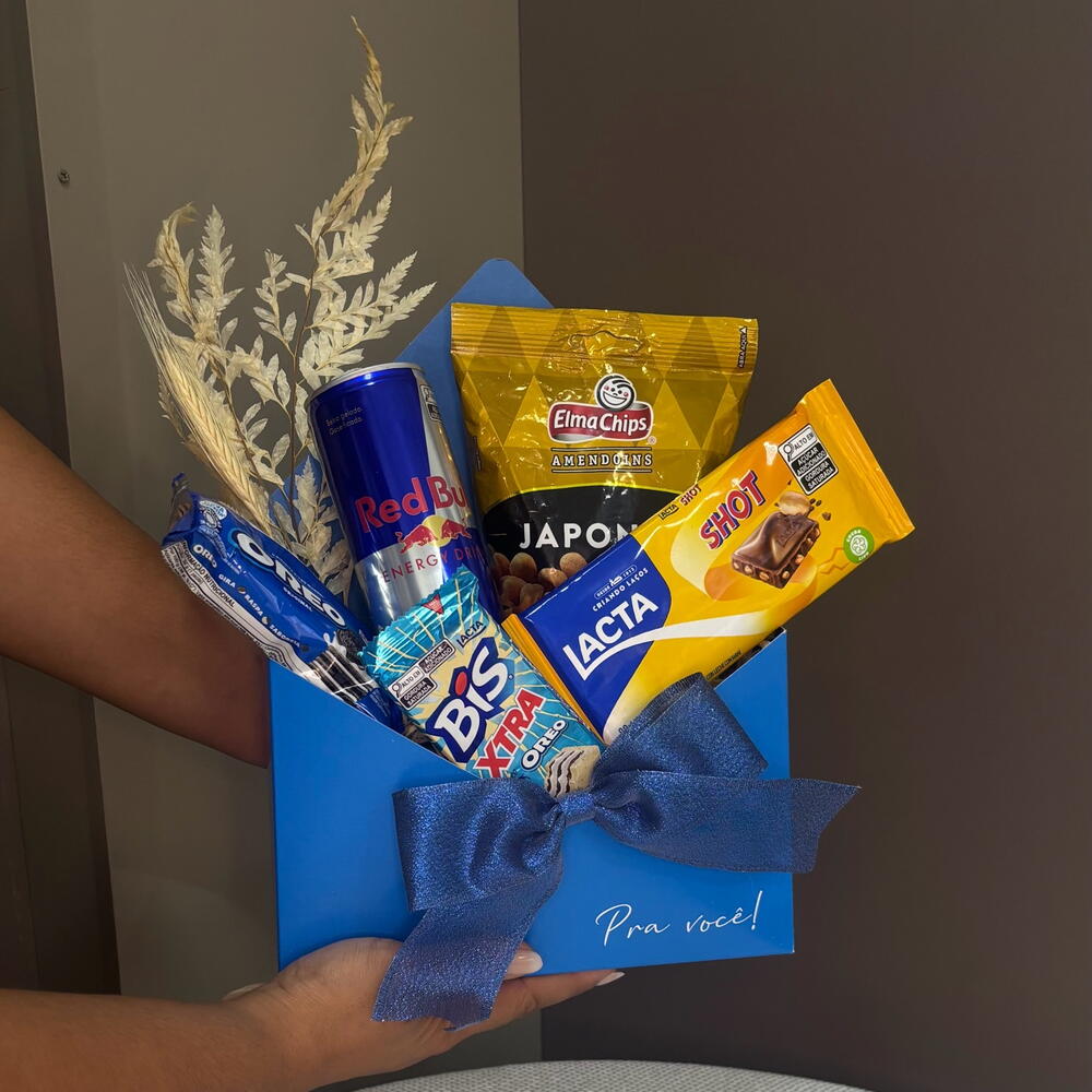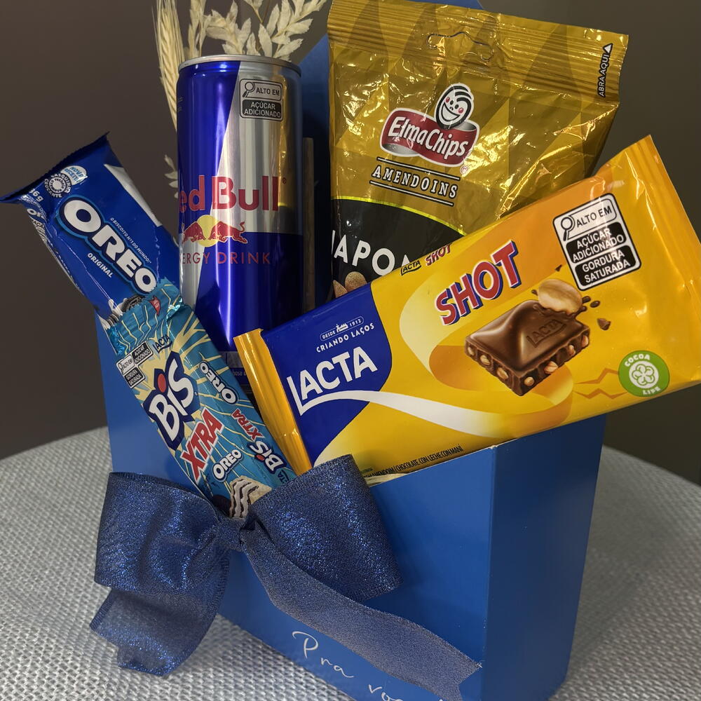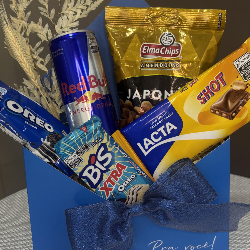 Descubra o aconchego de receber um Kit de Presente excepcionalmente selecionado e embalado com amor. O kit inclui uma variedade de delícias que são perfeitas para qualquer ocasião: um delicioso Amendoim Japonês para satisfazer o seu gosto exótico, um Bis Xtra 45g para adicionar doçura à sua pausa, um Oreo 36g para saborear a infância, uma lata de Red Bull 250ml para lhe dar asas, um Envelope Decorado para adicionar um toque pessoal ao presente e Lacta Shot para uma explosão de sabor de chocolate. Este kit de presente é a combinação perfeita de sabor, energia e emoção perfeitamente embalados para si.