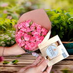 Lindo e delicado buquê de mini rosas spray cor de rosa embalado no kraft e celofane transparente. Kit contém: 1 Buquê de mini rosas spray cor de rosa 1 Caixa de Bombom Ferrro Rocher 50gr * Kit embalado para presente