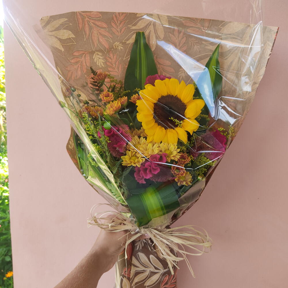 Este encantador buquê é composto por um deslumbrante girassol, que se destaca pelas suas cores intensas e brilhantes, contrapostas por uma seleção de folhagens especiais, que acrescentam um toque de frescura e naturalidade. O pacote é cuidadosamente envolvido em papel kraft e transparente, destacando o design natural dos componentes. Finalizado com um laço rústico, este buquê é a opção perfeita para demonstrar os seus sentimentos e tornar qualquer ocasião especial.