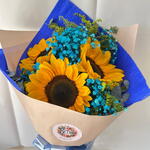 Este elegante buquê é composto por três deslumbrantes girassóis que irradiam alegria e positividade. Complementado por um acessório único, este arranjo floral cria um presente ideal para alegrar o dia de alguém especial.