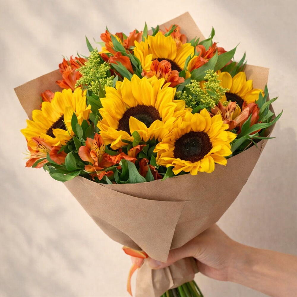 Este belo buquê é composto por 5 majestosos girassóis, símbolos de adoração e felicidade, complementados por 5 multicoloridas astromélias representando a amizade duradoura. Um toque de folhagem fresca adiciona um elemento de pulcritude natural. Para completar, o buquê é habilmente embrulhado numa elegante embalagem e atado com um laço charmoso. Um presente perfeito para expressar alegria e carinho em qualquer ocasião.