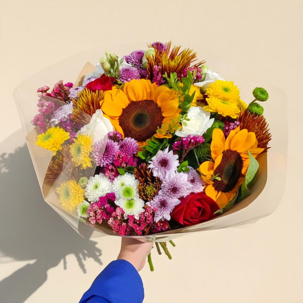 Este belo buquê é composto por uma requintada seleção de flores mistas, acompanhadas por folhagens cuidadosamente escolhidas para complementar seu design. Apresentado numa embalagem de designer exclusiva, cada buquê é finalizado com um laço charmoso, tornando-o perfeito para surpreender alguém especial ou simplesmente embelezar o seu ambiente. Um verdadeiro presente visual.
