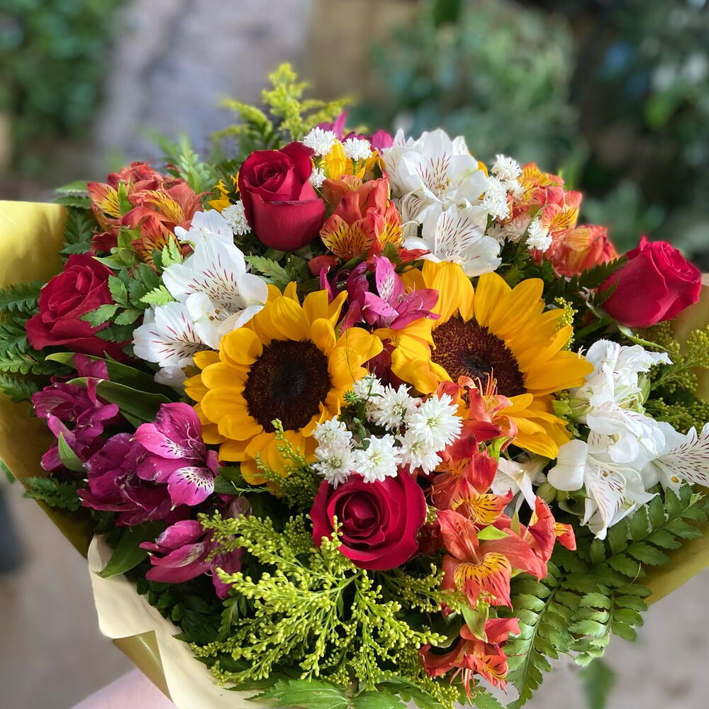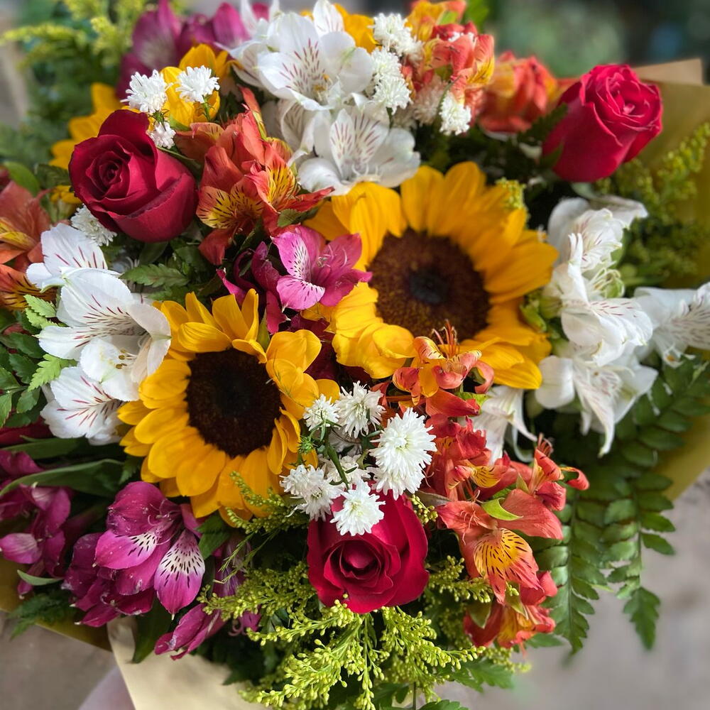 Ilumine o dia de alguém especial com este encantador buquê. Composto por dois vibrantes girassóis, quatro rosas vermelhas que simbolizam amor e respeito, uma delicada astrométria e um mix de flores do campo que trazem um toque de jovialidade e frescor. Tudo isso é cuidadosamente embalado em uma embalagem sofisticada e finalizado com um laço charmoso, proporcionando um presente perfeito para qualquer ocasião.