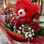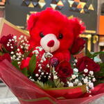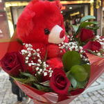 Conheça nosso lindo buquê com seis rosas vermelhas, e adicional de urso, podendo ter em cores variadas!