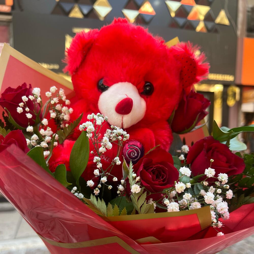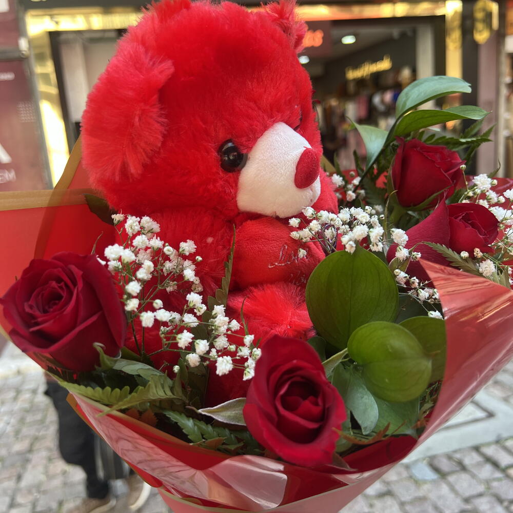Conheça nosso lindo buquê com seis rosas vermelhas, e adicional de urso, podendo ter em cores variadas!