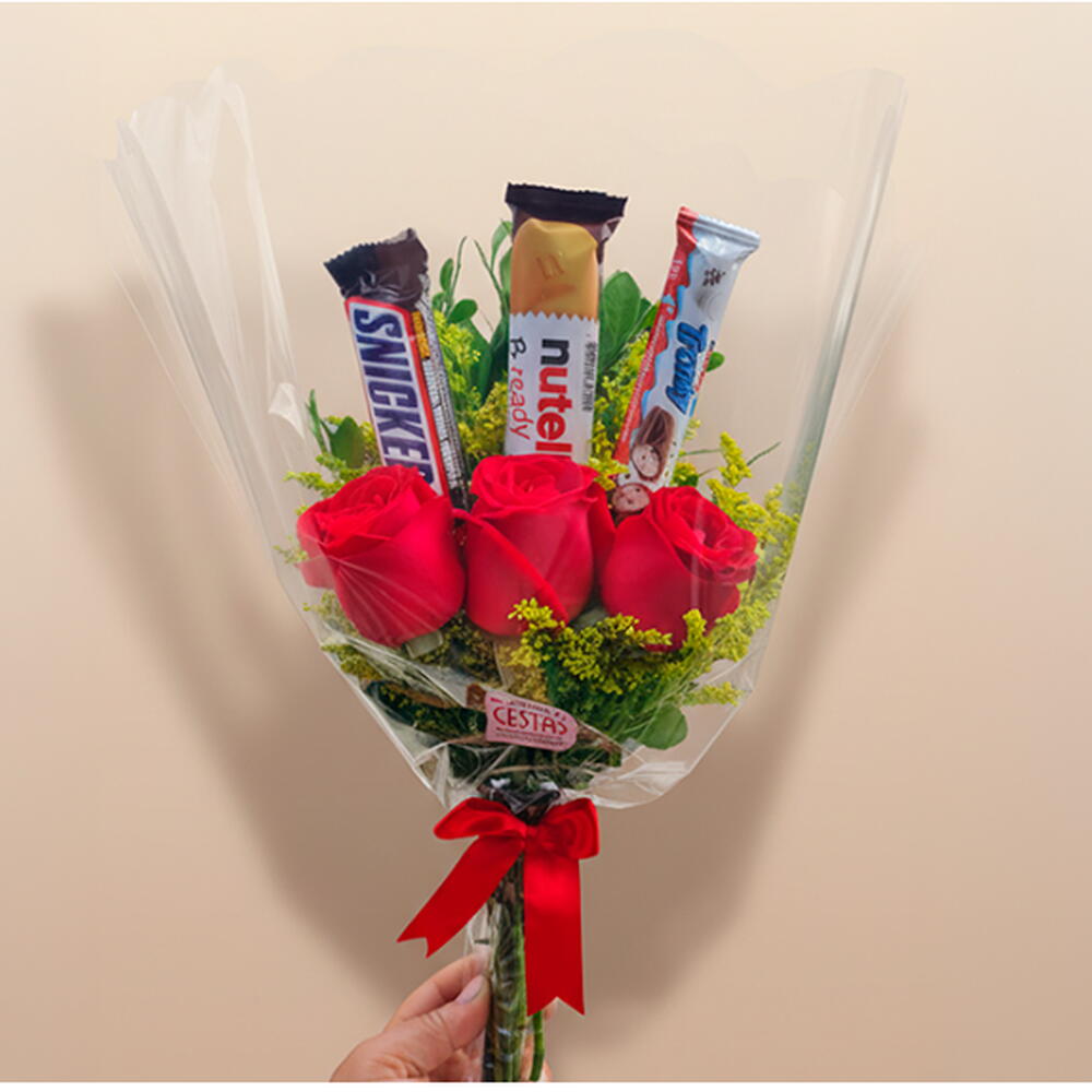 buquê floral com 3 rosa vermelhas naturais - 1 pcs snickers 45g (preso em aste no arranjo) - 1 pcs nutella b-ready 22g (preso em aste no arranjo) - 1 pcs tronky 18g (preso em aste no arranjo) - 1 pcs