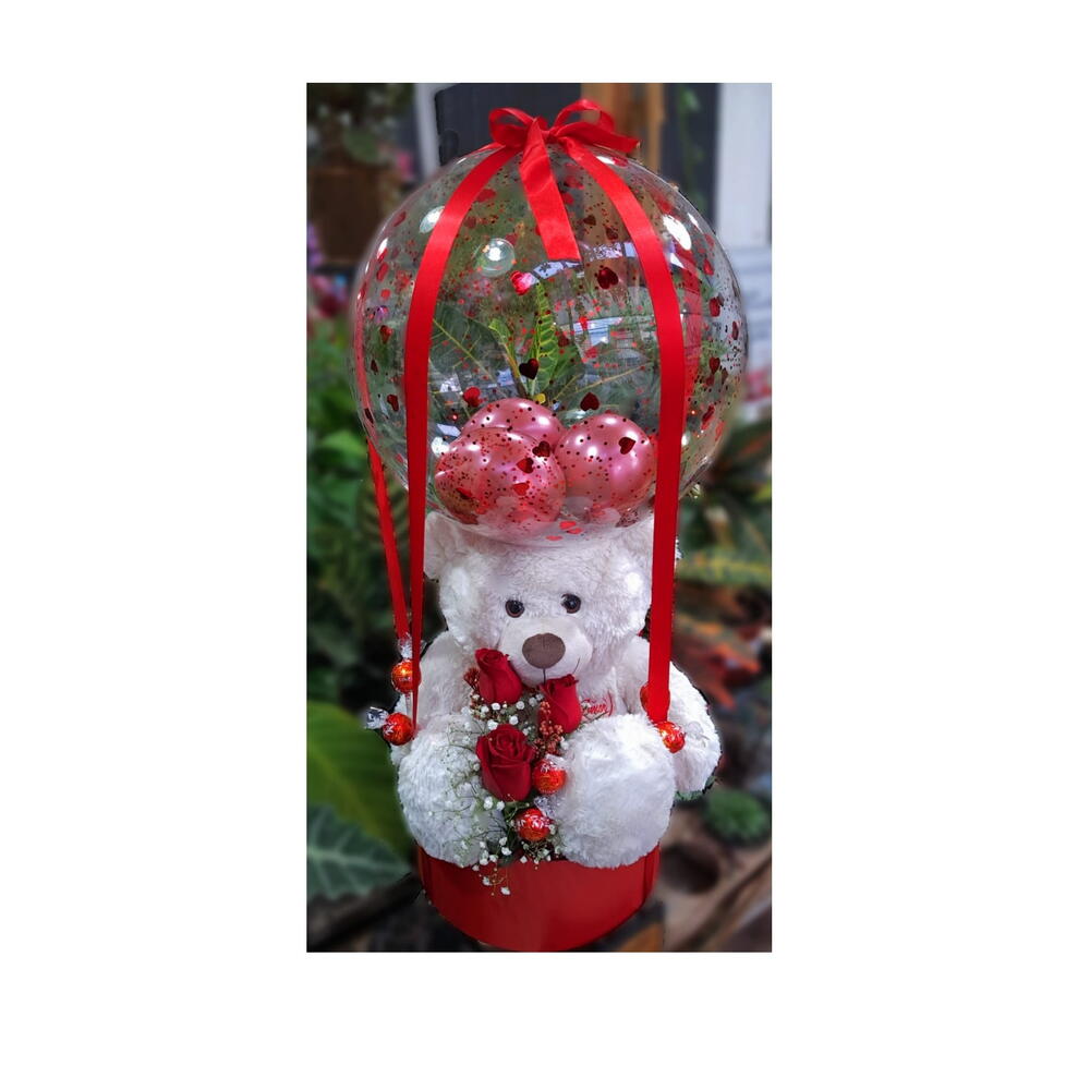 box - 1 pcs arranjo de flores - 1 pcs pelucia - 1 pcs laço em cetim - 1 pcs cx bombom lindt - 1 pcs balão romântico - 1 pcs