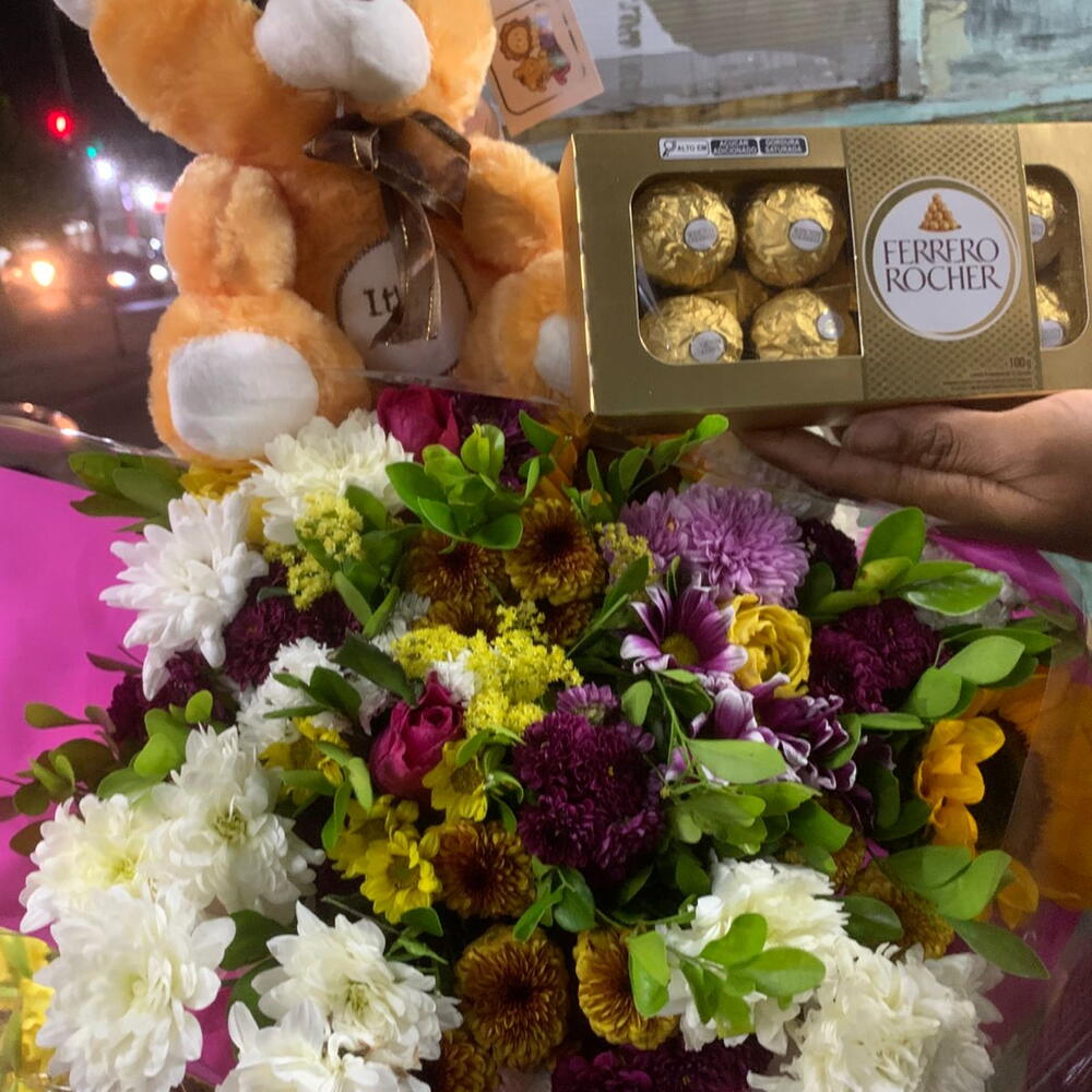 Presenteie seus entes queridos com esta bela combinação de doçura e carinho! Este pacote inclui um urso macio e adorável, acompanhado por uma caixa de bombons Ferreiro Rocher com 8 deliciosas unidades. Para aprimorar ainda mais este gesto amoroso, ele vem com um lindo buquê de flores mistas (sujeito à disponibilidade), tudo bem embalado e decorado com um laço elegante. É o presente perfeito para expressar seu amor e apreço.