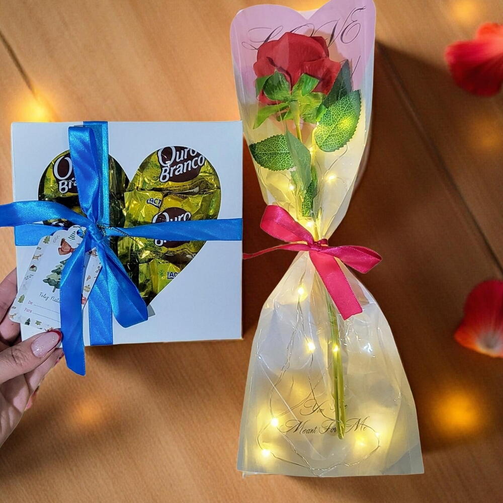 Ilumine o coração de quem você ama com este presente encantador! Uma caixa em formato de coração recheada com os deliciosos chocolates Ouro Branco, e uma rosa vermelha artificial que brilha com luzes LED, simbolizando um amor eterno. Acompanha um cartão especial para você deixar sua mensagem de amor ou Você é para mim. Perfeito para surpreender e emocionar!