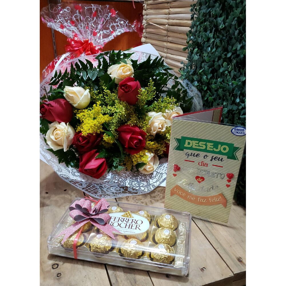 Este kit de presente é a escolha perfeita para mostrar o seu carinho e apreço. Composto por um lindo buquê com 8 rosas mistas, cuidadosamente selecionadas e arranjadas, complementadas por lindas folhagens. O buquê é habilmente acondicionado em uma embalagem elegante e amarrado com um laço charmoso. Além disso, inclui um cartão para que você possa personalizar a sua mensagem e uma deliciosa caixa de Ferrero Rocher para adicionar um toque doce ao seu presente. Este kit de presente é mais que um simples presente, é uma experiência única e memorável.