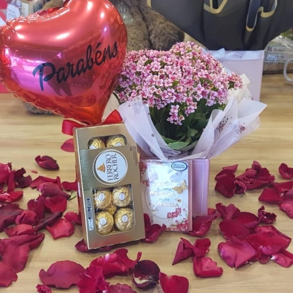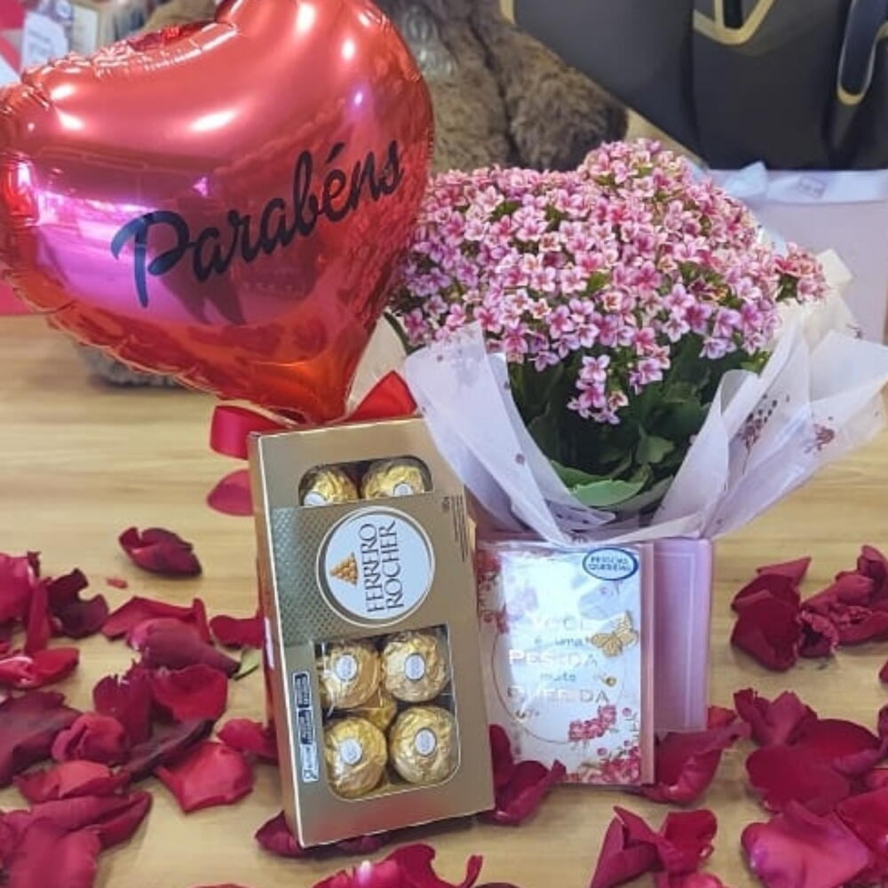 embalagem - 1 pcs cartão personalizado - 1 pcs ferrero rocher 100g - 1 pcs box (caixa) - 1 pcs mini kalanchoê - 1 pcs balão de coração parabéns - 1 pcs