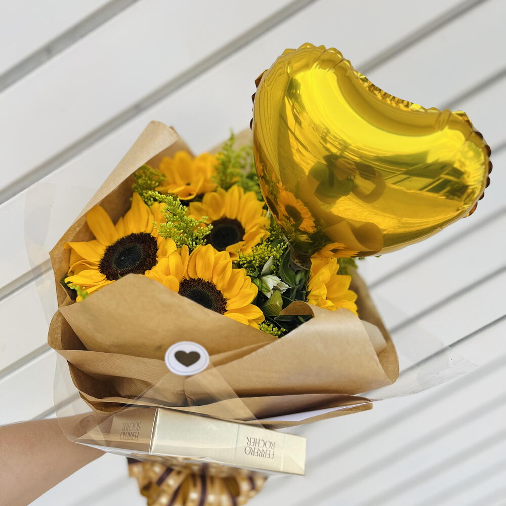 girassois - 6 pcs astromelia - 3 pcs tango e folhagem - 15 pcs ferrero rocher caixa 8 unidades - 1 pcs balão coração dourado - 1 pcs