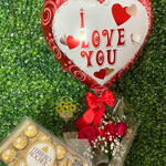 folhagens diversas - 4 pcs rosa vermelhas - 4 pcs ferrero rocher 150g - 1 pcs balão coração - 1 pcs embalagens para presente - 1 pcs