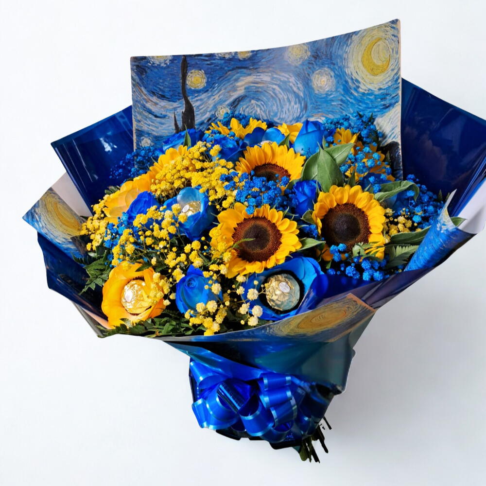 girassol - 6 pcs ferrero rocher - 8 pcs rosa azuis - 6 pcs