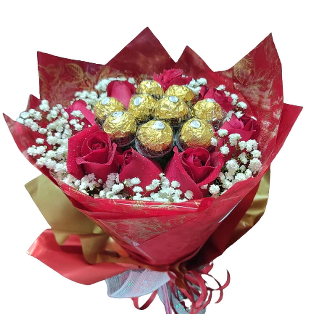 laço de cetim - 1 pcs celofane - 1 pcs bombons ferrero rocher - 9 pcs rosa vermelhas - 10 pcs folhagens verdes - 1 pcs