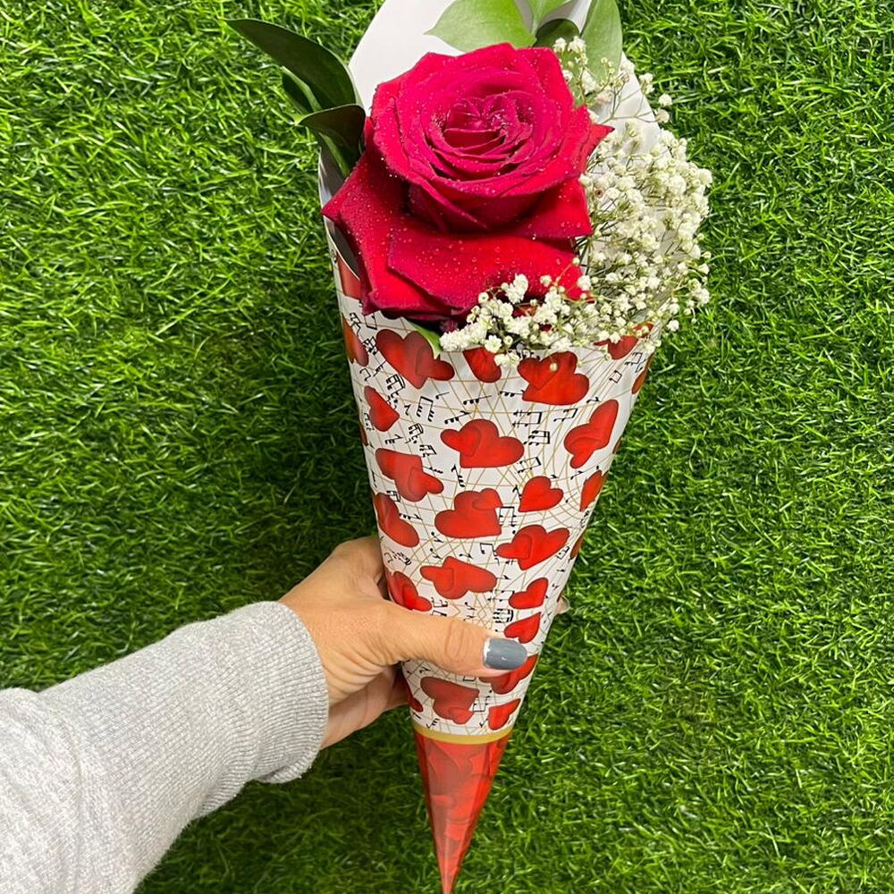 rosa importada embalada em cone decorado com detalhes musicais e corações. Um presente delicado e cheio de sentimento, como uma canção feita para tocar o coração de quem se ama.