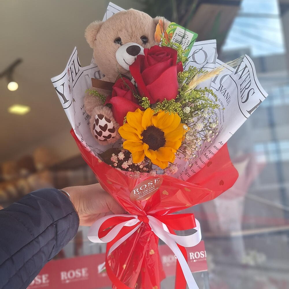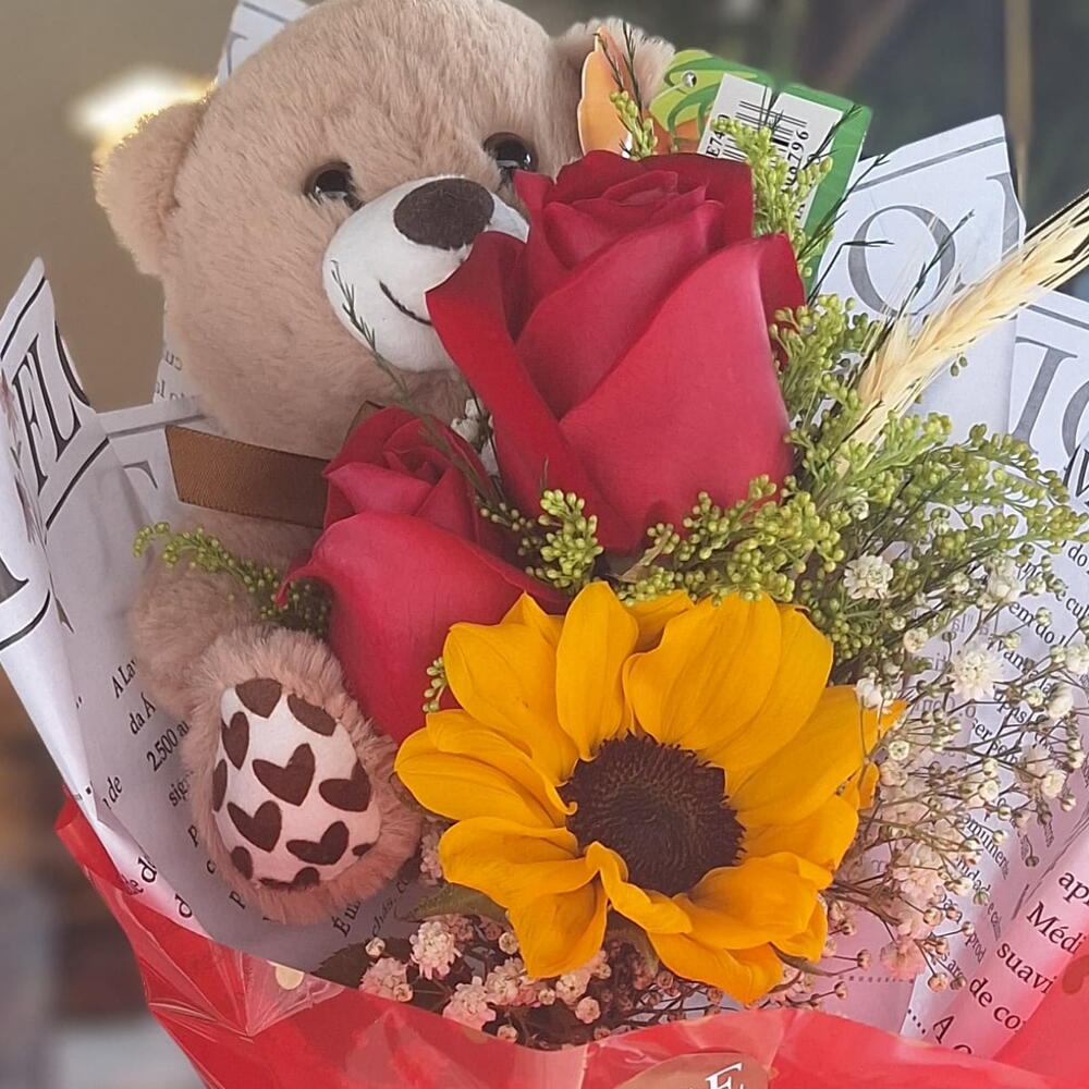 Este encantador kit de presente é cuidadosamente composto por dois delicados rosas vermelhas e um vibrante girassol, símbolos de amor e felicidade. Uma adorável pelúcia pequena complementa o conjunto, criando um presente perfeito para momentos especiais. Tudo isso é criteriosamente embalado em uma caixa artesanal e finalizado com um elegante laço. Este é o presente ideal para mostrar o quanto você se importa.
