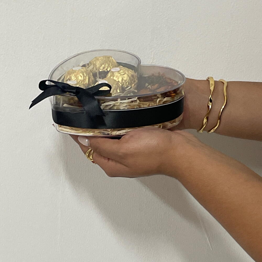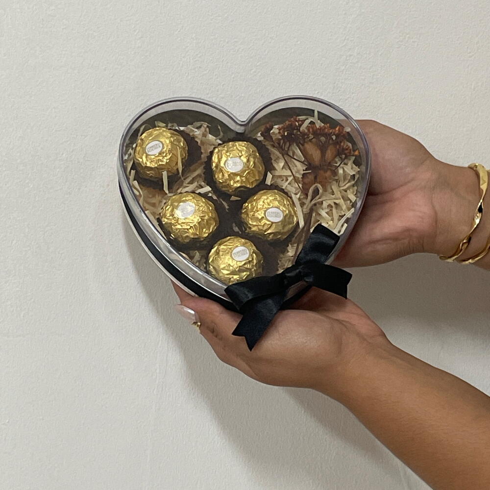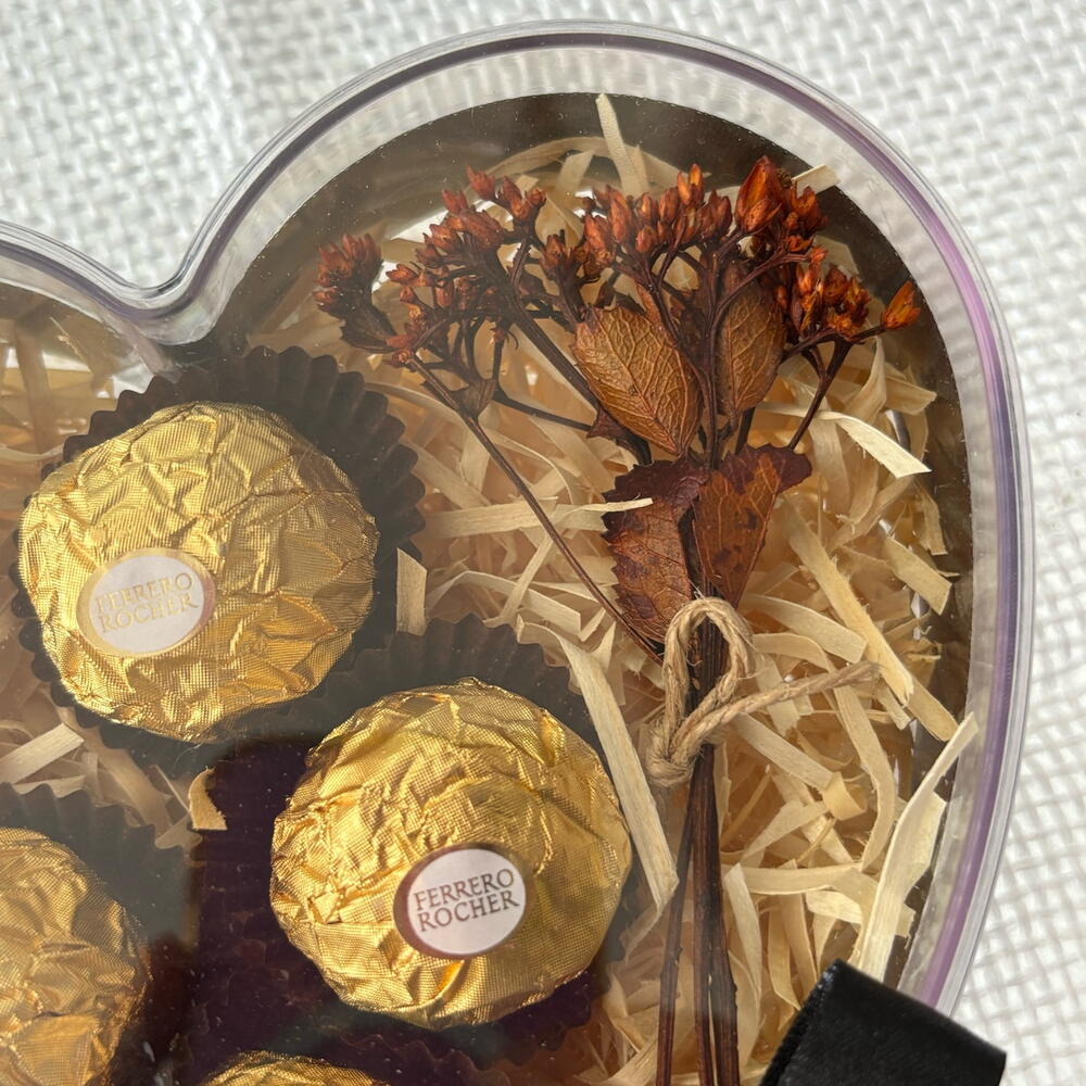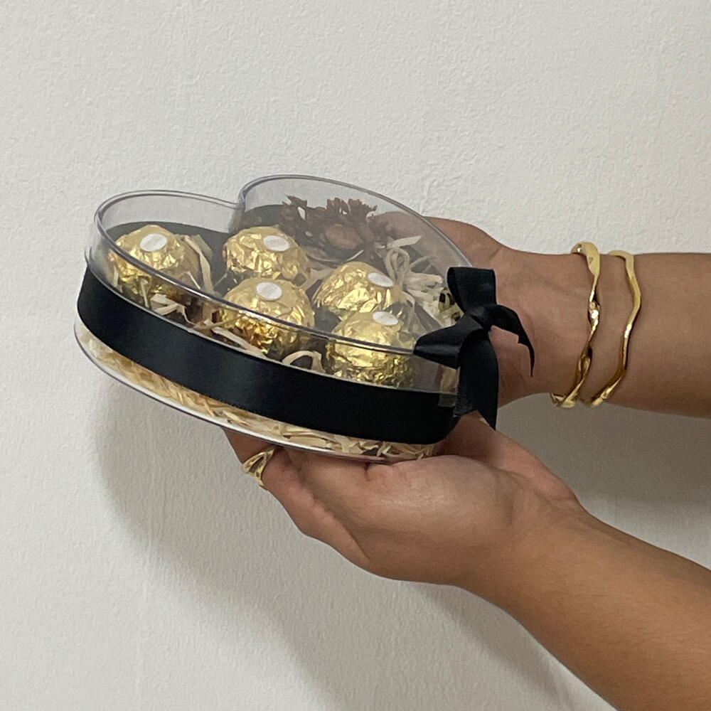 Presenteie alguém especial com este elegante presente com chocolate. Ele inclui 5 unidades de Ferrero Rocher, oferecendo um sabor inigualável que derrete na boca. A base do presente é um coração acrílico, adicionando um elemento romântico e sofisticado ao conjunto. Além disso, um raminho desidratado proporciona um toque final perfeito, tornando-o uma escolha sublime para aniversários, aniversários e outras ocasiões especiais.